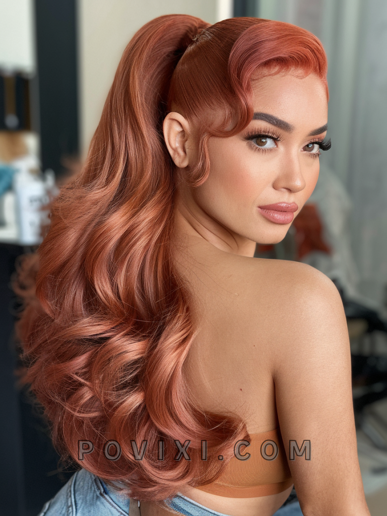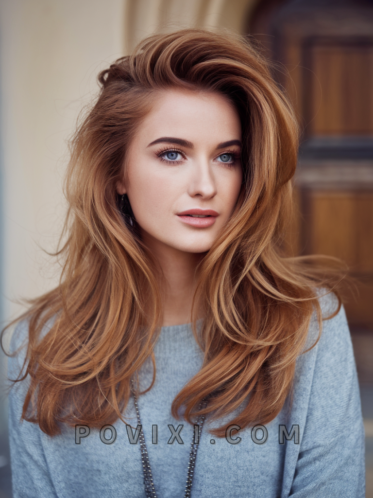 The voluminous blowout featuring honey tones offers a glamorous touch to strawberry blonde hair. With its smooth texture and soft curls, this style is ideal for formal events or a night out. It works well for oval and square-shaped faces, enhancing blue and brown eyes with its warm undertones.