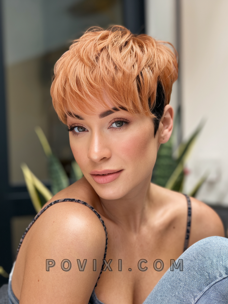 The textured pixie cut with dark roots is a chic and low-maintenance option for those with short hair. This style suits heart-shaped faces and creates a striking contrast with light strawberry blonde tones, perfect for everyday wear.