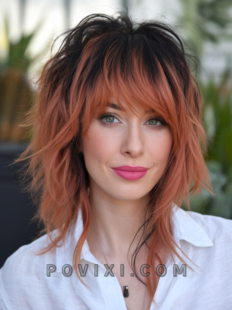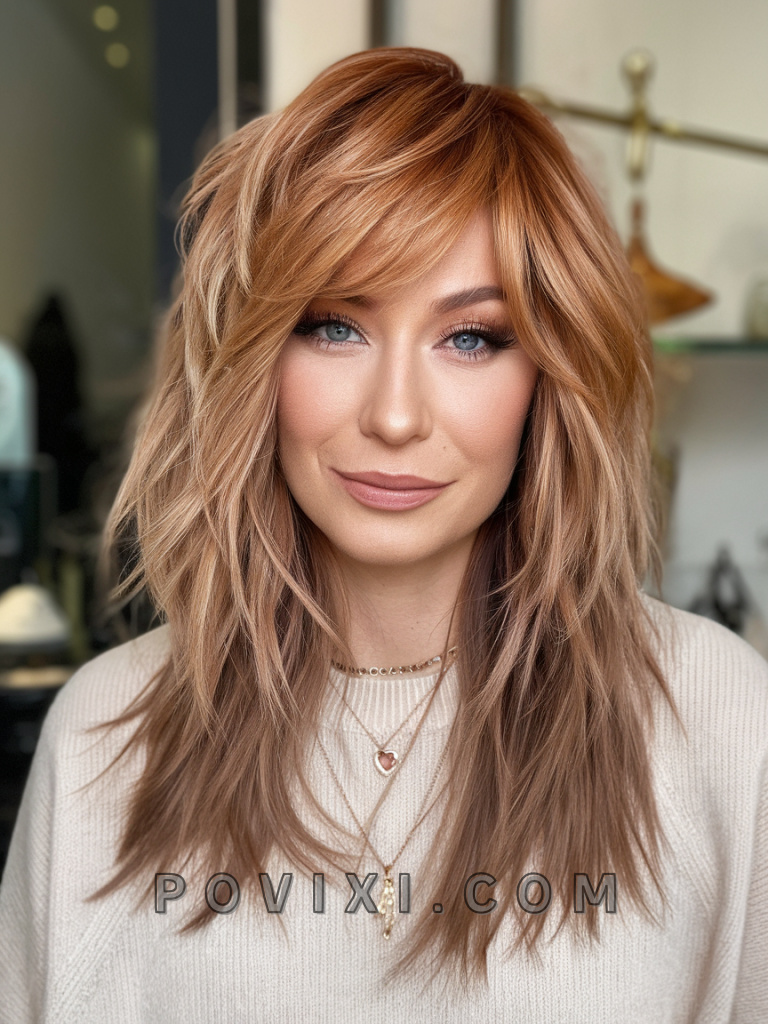 The layered shag combines edgy vibes with softness, thanks to the incorporation of lowlights. Adding darker streaks enhances the strawberry blonde color, making it ideal for casual outings or concerts. This cut complements oval and square-shaped faces, adding movement and volume to the hair.