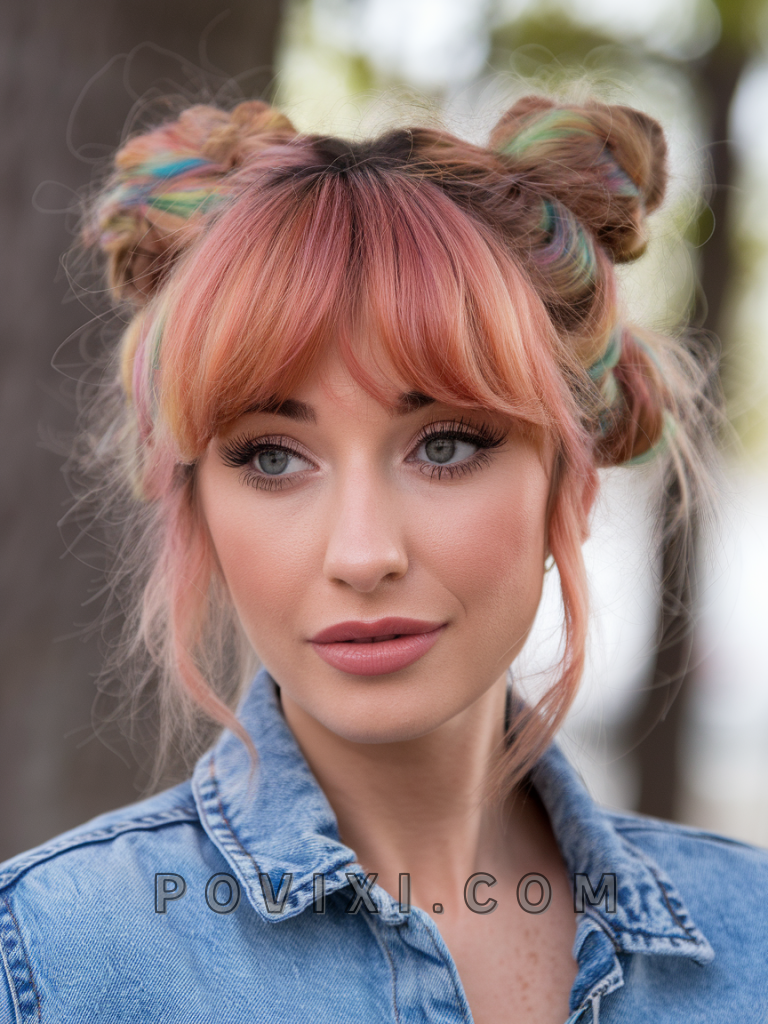 Half-up space buns combined with rainbow babylights are perfect for festivals or quirky events. The pops of color in strawberry blonde hair create a whimsical and playful effect, ideal for heart-shaped faces and expressive personalities.