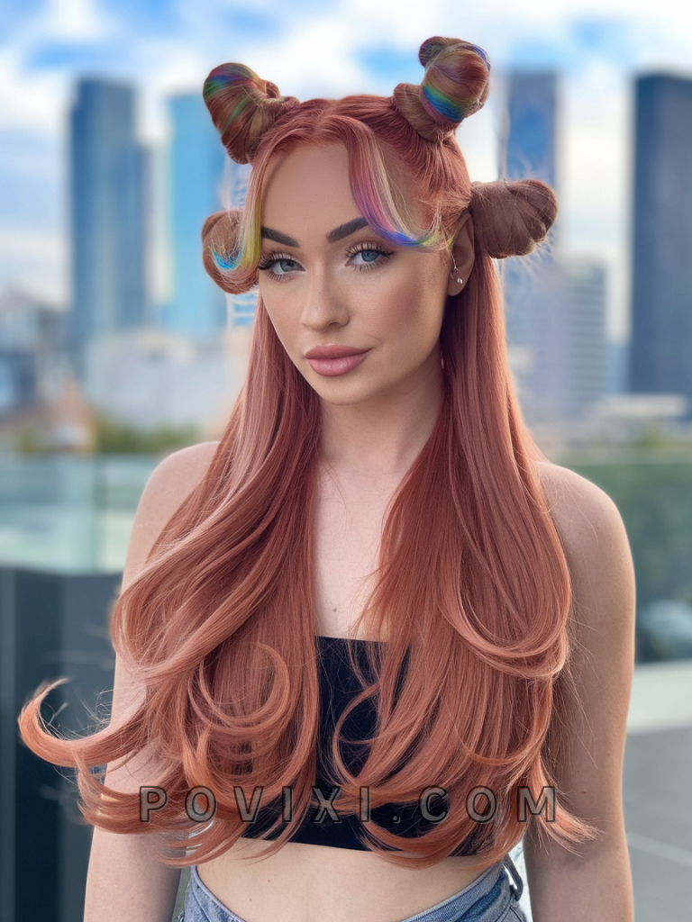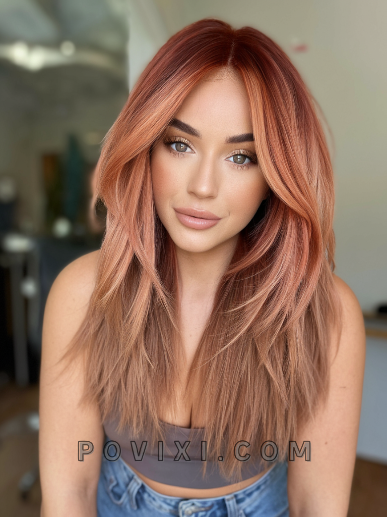 To recreate this look, lighten selected sections underneath your hair and apply a strawberry blonde dye. A flat iron can enhance the sleek finish, while leave-in conditioners like Olaplex No.6 ensure smooth, hydrated locks. Avoid frequent washing to maintain the vibrancy of the color highlights.