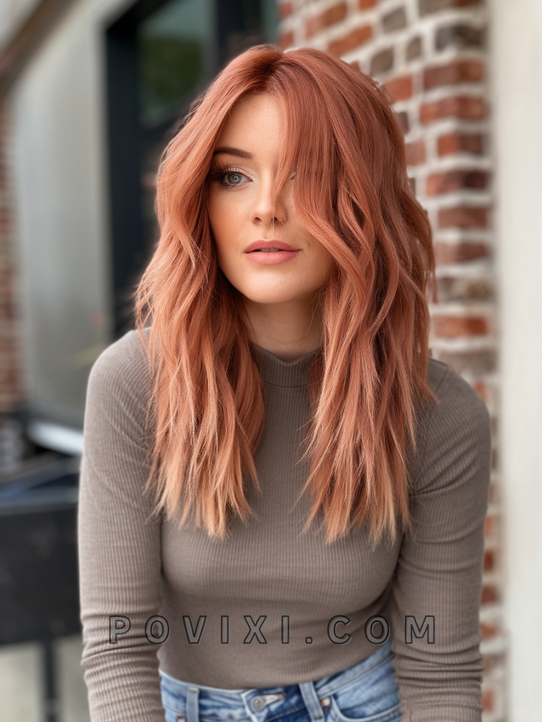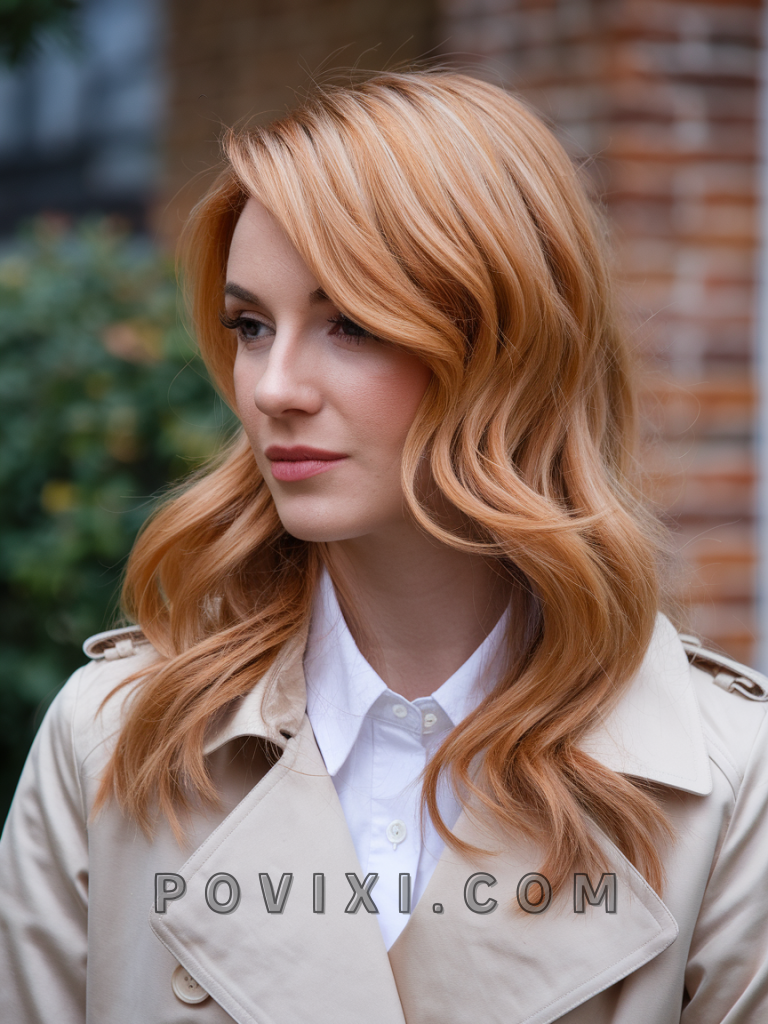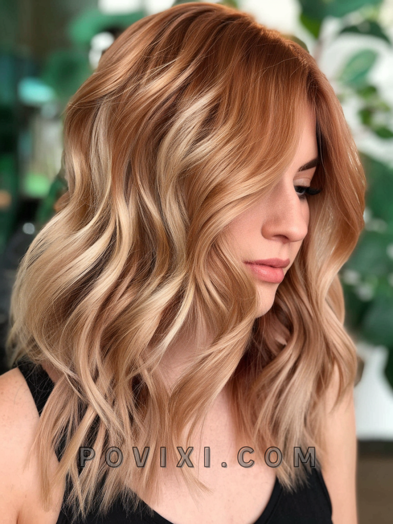 The soft balayage waves highlight the best of strawberry blonde hair, with cool, light, and golden tones blending seamlessly. Perfect for casual outings or romantic dinners, this look exudes effortless charm. Ideal for those with medium length or long hair, it frames round and oval-shaped faces beautifully. The blend of warm and cool hues also enhances brown eyes and green eyes, adding depth to your overall appearance.