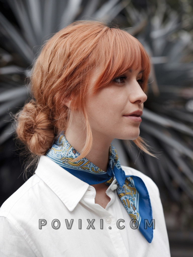 The sleek low bun paired with soft side bangs adds understated elegance to strawberry blonde hair. This versatile style suits formal occasions, accentuates oval faces, and complements blue eyes.