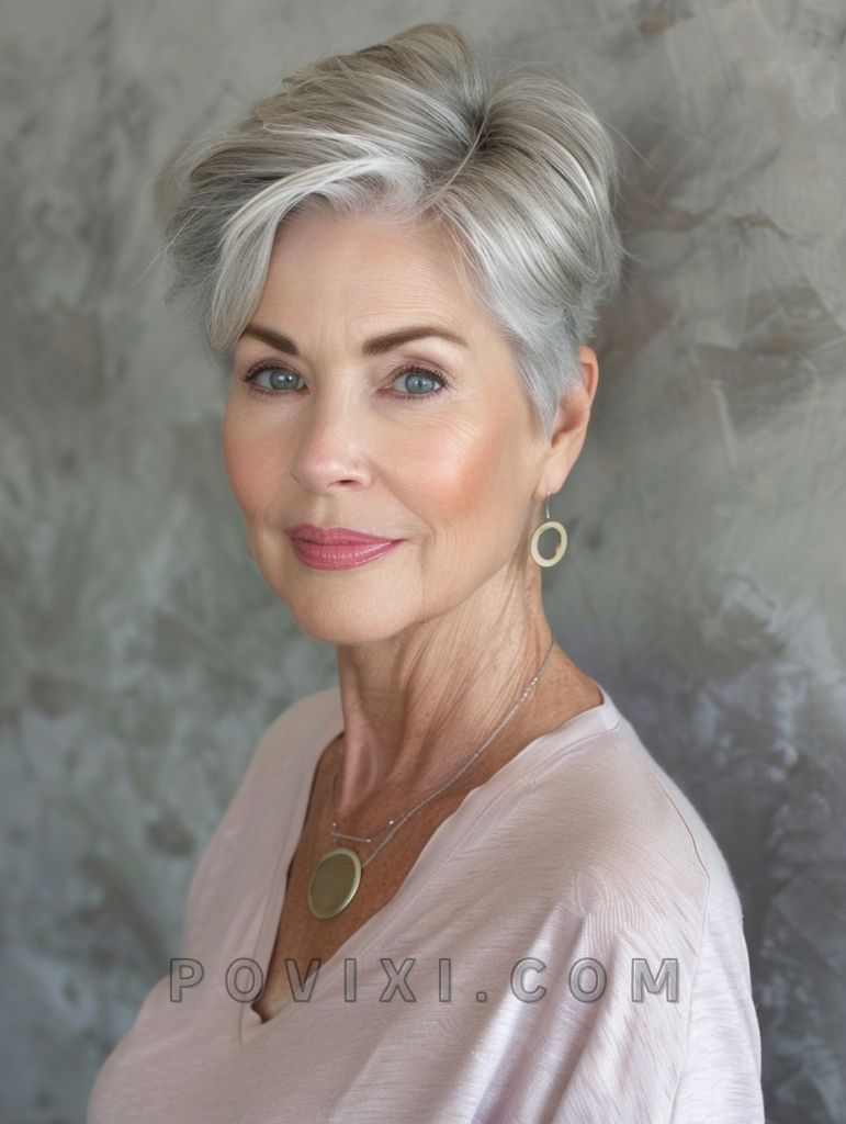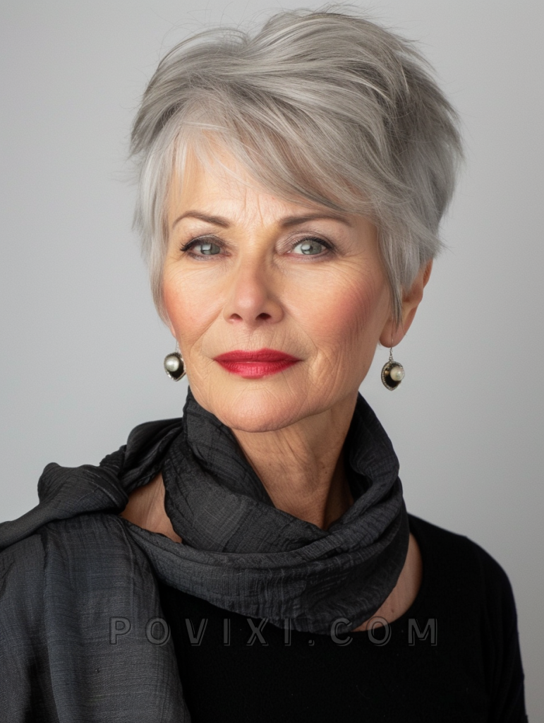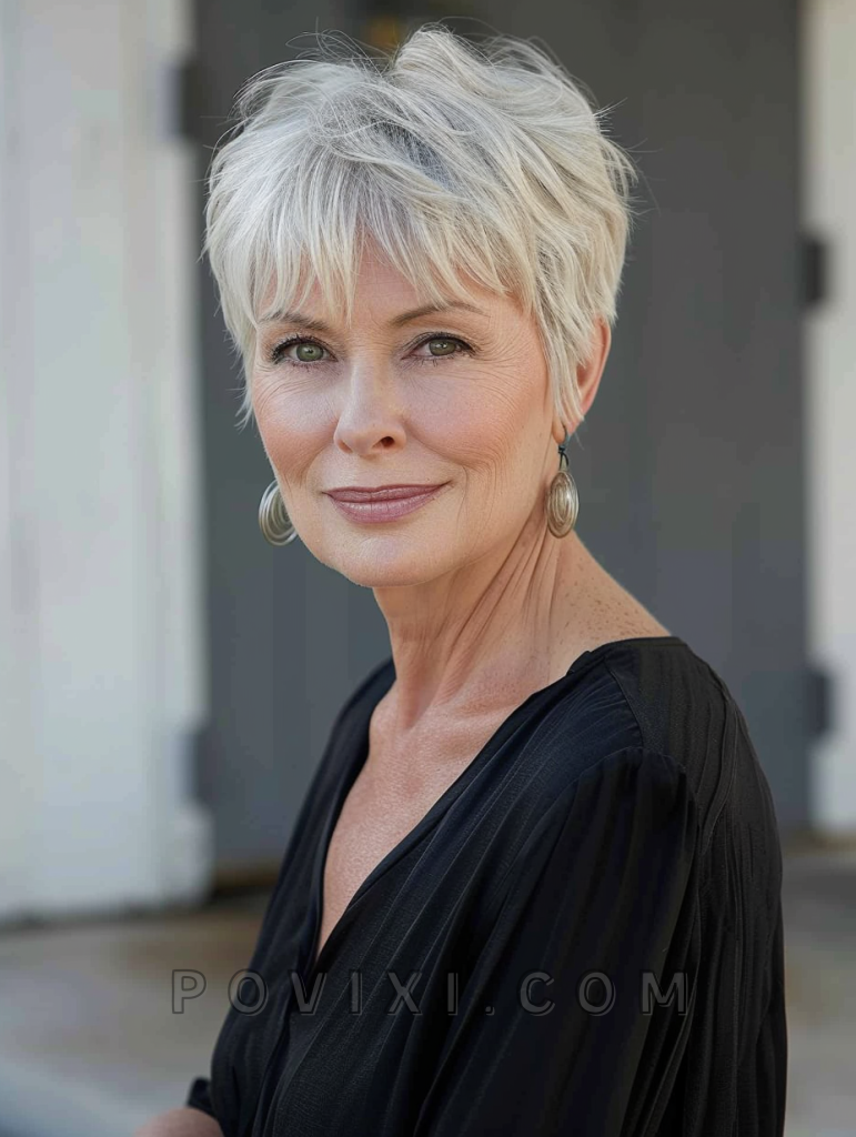 The pixie cut with bangs is a timeless, chic, and versatile hairstyle perfect for older women. This style involves short, layered hair with soft bangs that can be styled straight or slightly tousled. The pixie cut frames the face beautifully, making it ideal for women with round faces and those who wear glasses. The style adds a youthful touch and works well with both fine and thick hair. Whether you have a busy day ahead or a special evening event, this haircut is easy to manage and always looks polished.