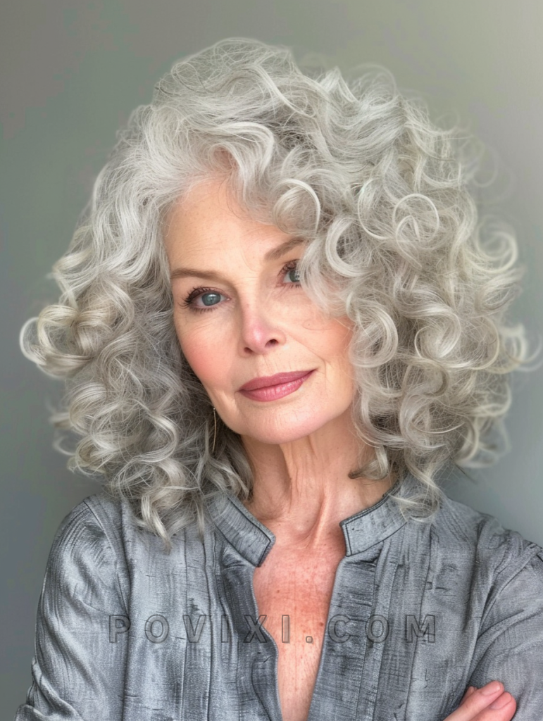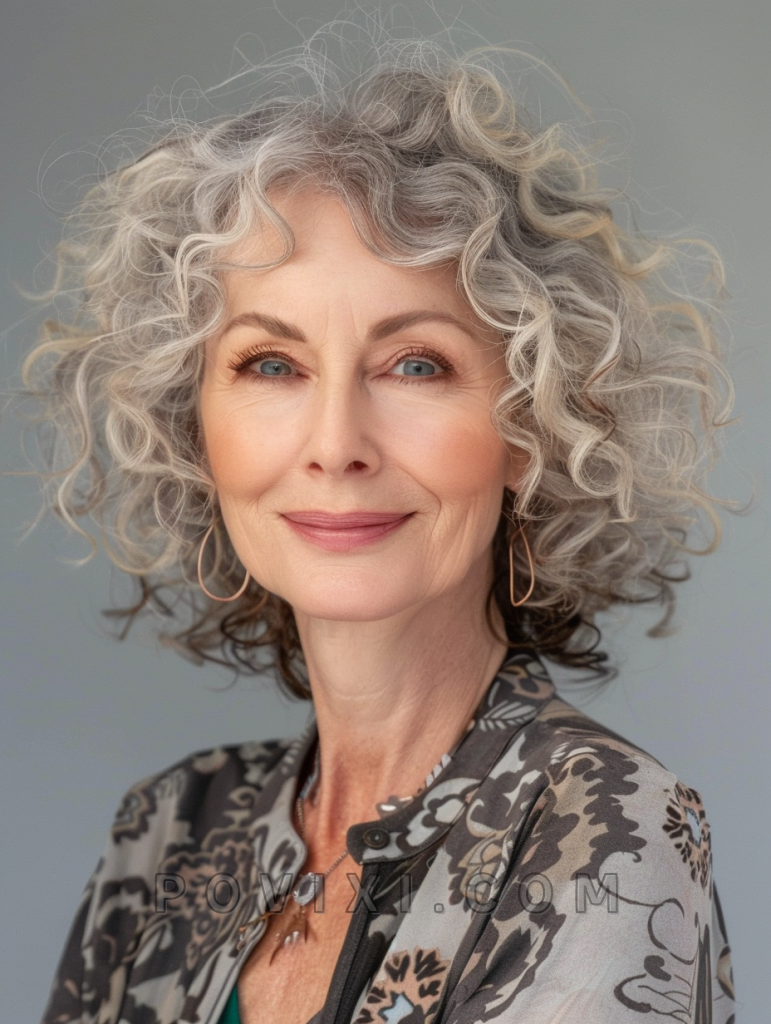 The curly bob is a stylish and elegant option for older women with natural curls. This hairstyle features a bob cut that enhances your natural curl pattern, adding volume and movement. It’s perfect for those with curly hair and suits various face shapes, including round faces.