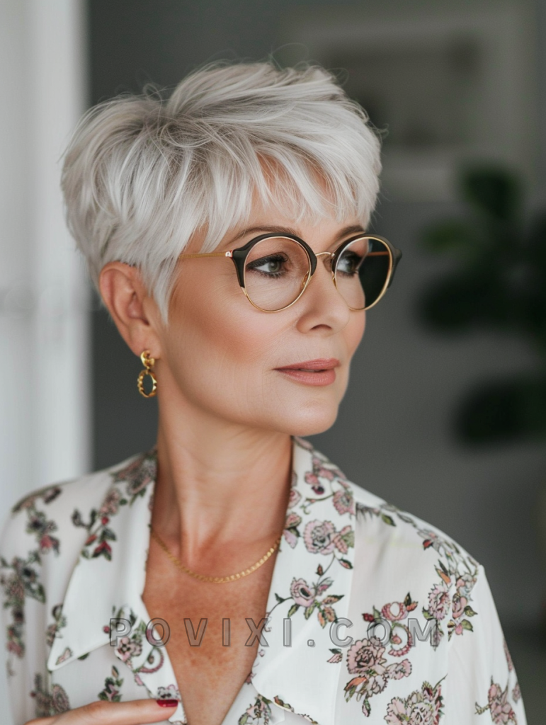 The feathered pixie is a soft and elegant hairstyle that features feathered layers for a light and airy look. This cut is perfect for older women with fine hair and those who wear glasses. It adds a touch of femininity and sophistication.