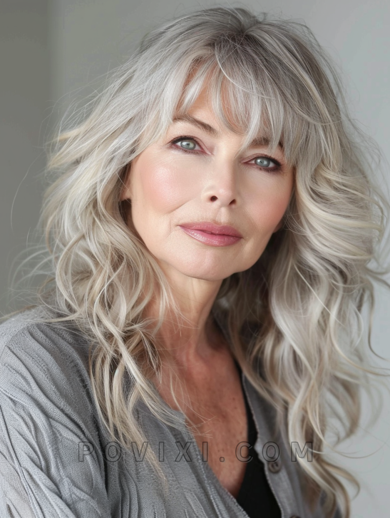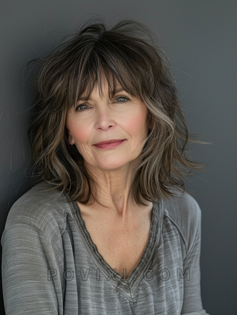 The modern shag with bangs is a trendy and youthful hairstyle that adds texture and volume to your hair. This style features shaggy layers with soft bangs, creating a relaxed and stylish look. The modern shag is perfect for older women with fine hair and those who wear glasses. It’s a versatile option that can be styled in various ways for different occasions.