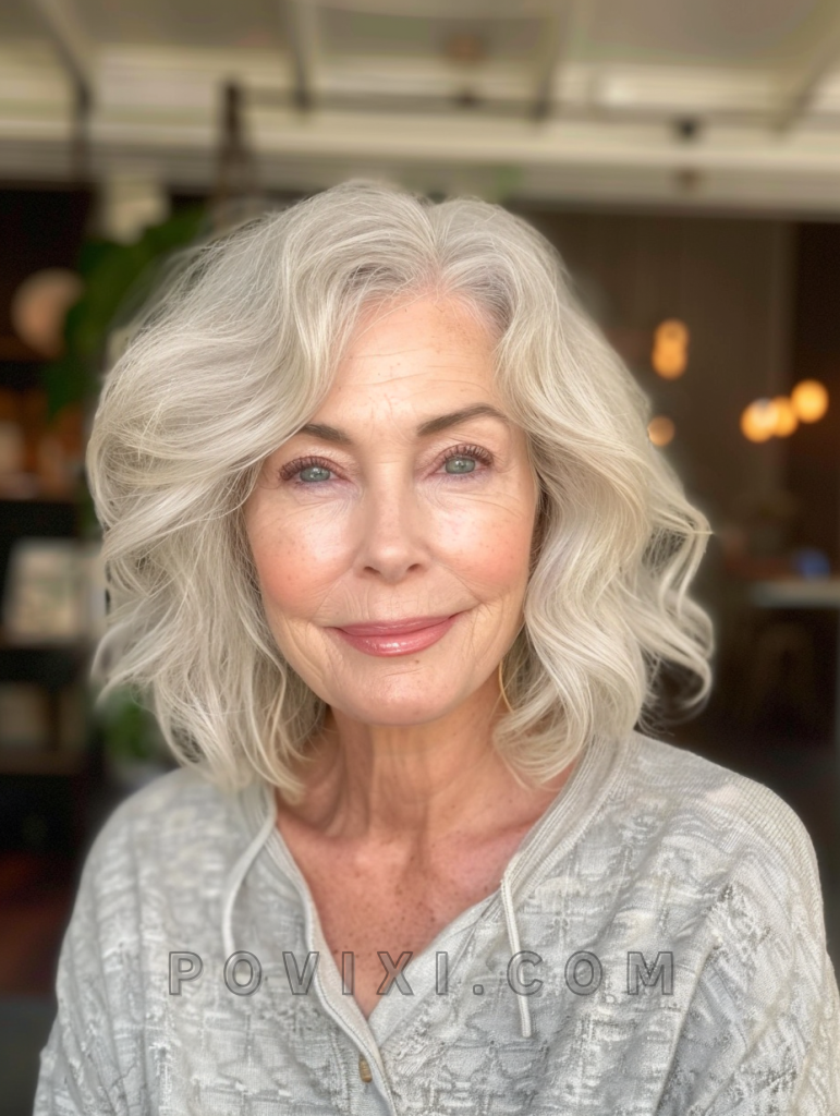 The soft waves bob is a romantic and feminine hairstyle that features gentle waves throughout a bob cut. This style adds a touch of elegance and is perfect for older women with fine hair. It suits various face shapes, including round faces, and pairs beautifully with glasses.