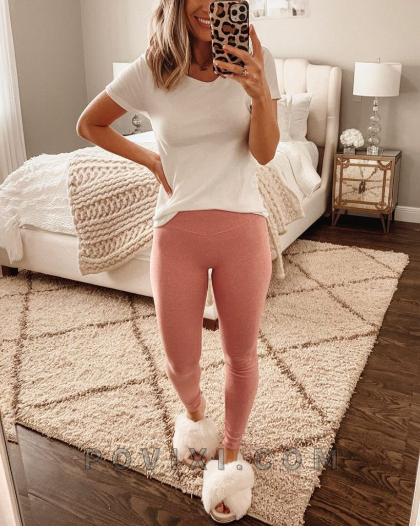 A soft, neutral look is perfect for home or casual outings. This outfit pairs a classic white tee with aesthetic blush pink leggings for a look that feels like a warm hug. The plush, furry slippers add a cozy finishing touch, making this ensemble ideal for mornings or relaxed evenings indoors. If you’re working from home but still want to feel put-together, this is an excellent option. Pair this with a cropped hoodie or oversized knit cardigan for added warmth.