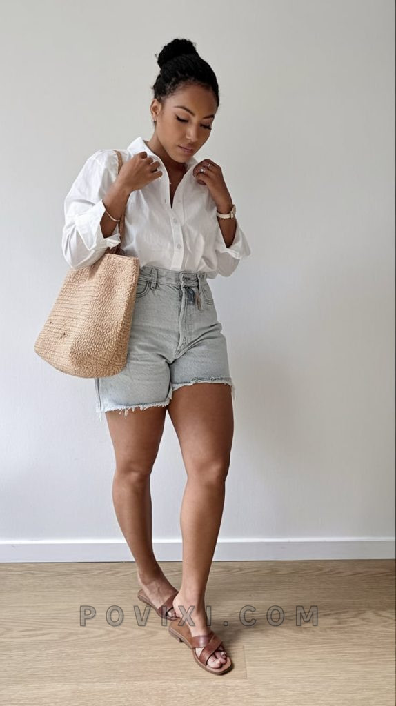 When in doubt, a crisp white shirt and distressed denim shorts are the ultimate lazy-yet-chic combination. The woven tote bag and brown sandals complete this breezy look, making it a staple for summer casual and weekend getaways. The relaxed yet stylish approach makes it an ideal transitional outfit for spring. Roll up the sleeves and add layered necklaces to elevate the simplicity.