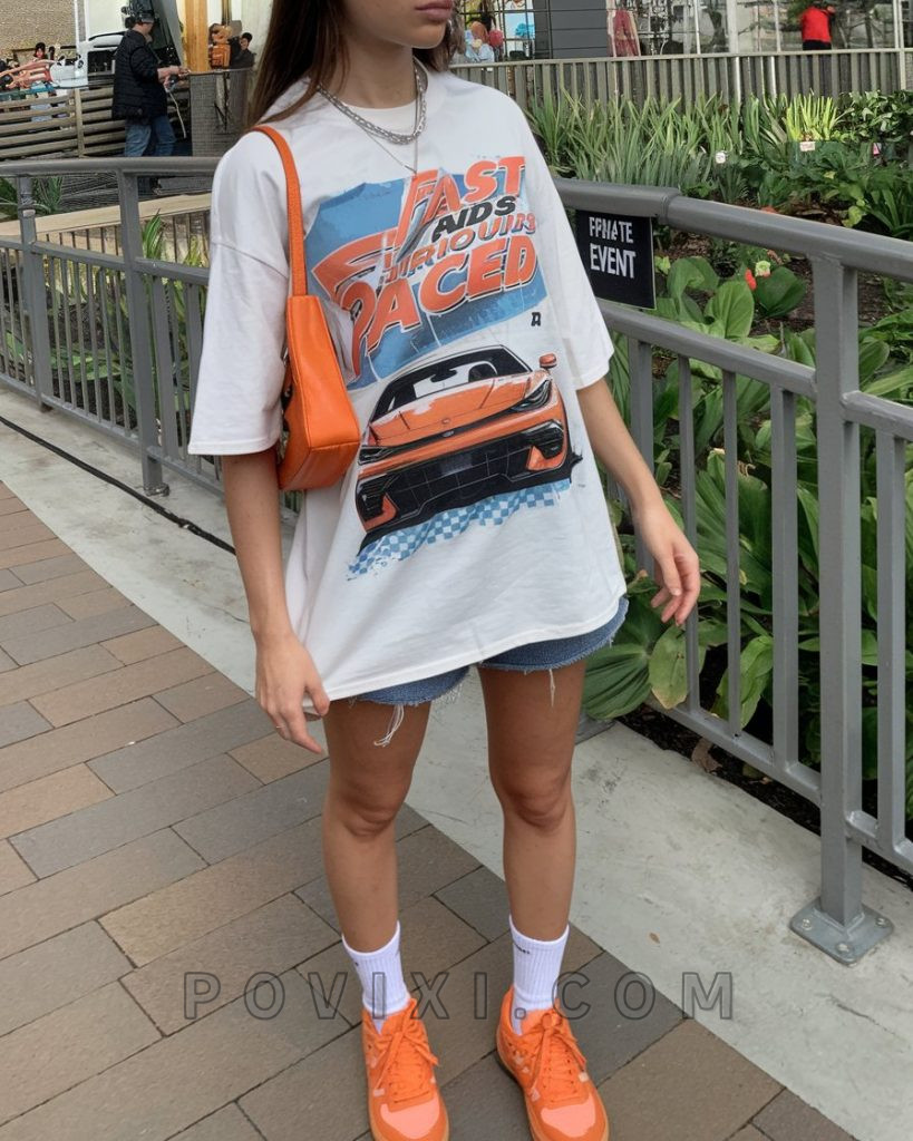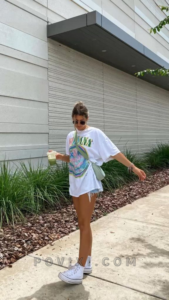 An oversized graphic tee paired with denim shorts and bright sneakers creates the ultimate relaxed yet trendy outfit. This look is perfect for summer, offering breathability while keeping the aesthetic playful and bold. Adding a matching crossbody bag ties the whole look together effortlessly. Pair this with white crew socks for that extra touch of laid-back street style. The bright tones in this outfit make it a standout choice for summer casual looks, giving a fresh and youthful vibe. You can switch up the colors to match your mood, whether you’re feeling bold with neon hues or prefer pastels for a softer touch.