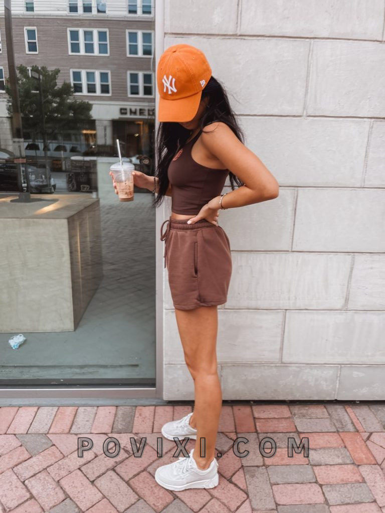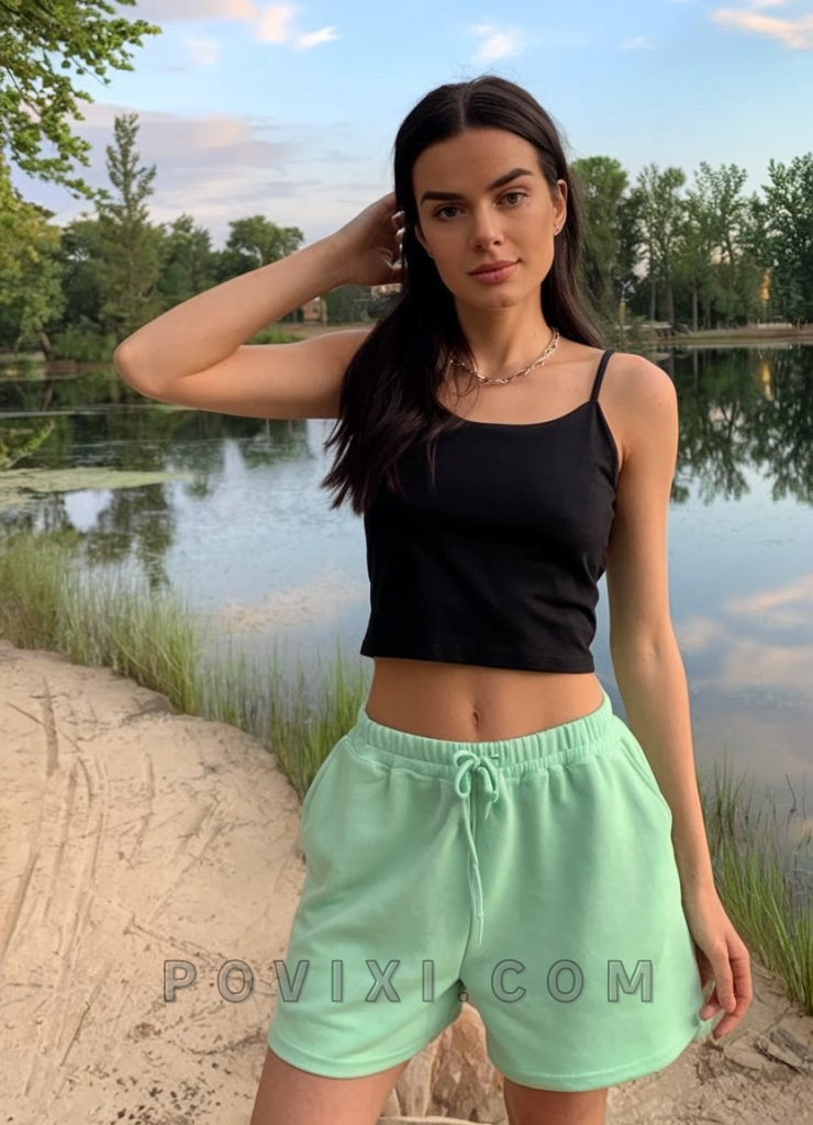 When you need an outfit that’s easy to throw on yet looks trendy, a fitted crop top and soft drawstring shorts are the perfect combo. The black tank top and mint summer shorts create a striking contrast that feels fresh and modern. Layer with an oversized denim jacket or a cardigan to extend this outfit into cooler months.