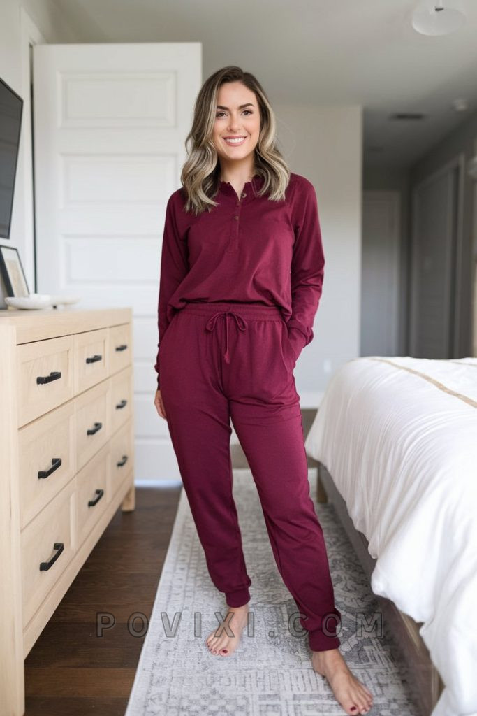 Monochrome loungewear never goes out of style, and this deep burgundy two-piece set is a prime example. The buttoned long-sleeve top adds a touch of structure, making it appropriate for school drop-offs or casual meetings. The joggers bring a seasonal touch, keeping you warm and comfortable. Whether you’re binge-watching your favorite series or heading out for a quick errand, this set keeps you effortlessly stylish. Throw on a pair of white sneakers and a tote bag to make it more street-style appropriate.