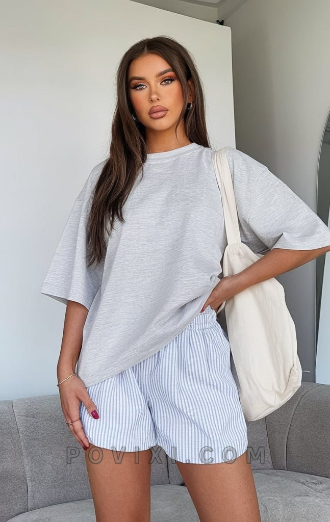 A gray oversized tee and striped shorts make a simple yet polished for home outfit. Whether you’re lounging around or stepping out for errands, this look is both stylish and incredibly comfortable. Add a tote bag to complete the minimal aesthetic.