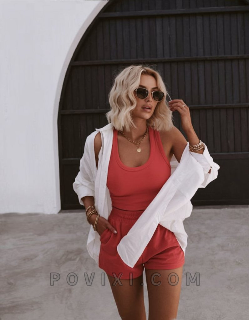 A coordinated summer casual set is a must-have for any wardrobe. This look features a red tank top paired with matching summer shorts, layered with an oversized white button-down. The effortless styling makes it a great choice for summer, especially when you’re heading to the beach or just taking a walk in the city. Swap the sneakers for sandals or slides if you want a laid-back yet sophisticated edge. This look also transitions well with the addition of sneakers and a cropped jacket.