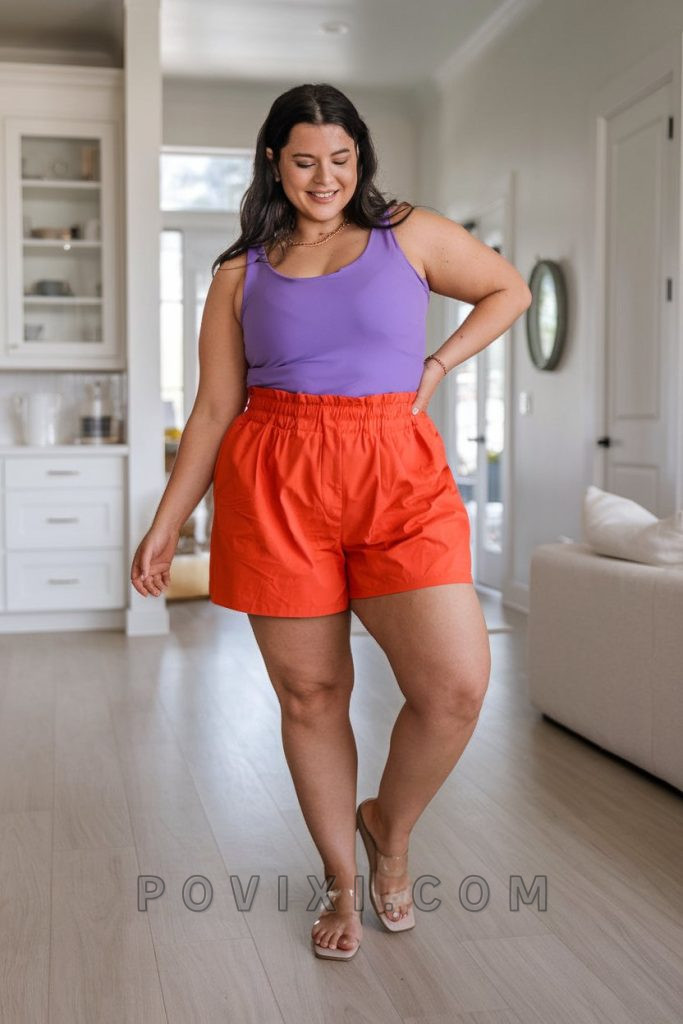 Vibrant color-blocking continues to be a key trend in 2025, making this combination of a bold purple tank top and fiery orange shorts an instant head-turner. Whether you’re embracing black women fashion trends or just love an eye-catching season-appropriate outfit, this look is both fun and flattering. Keep accessories minimal to let the colors shine. A pair of nude or transparent sandals add a subtle touch of sophistication.