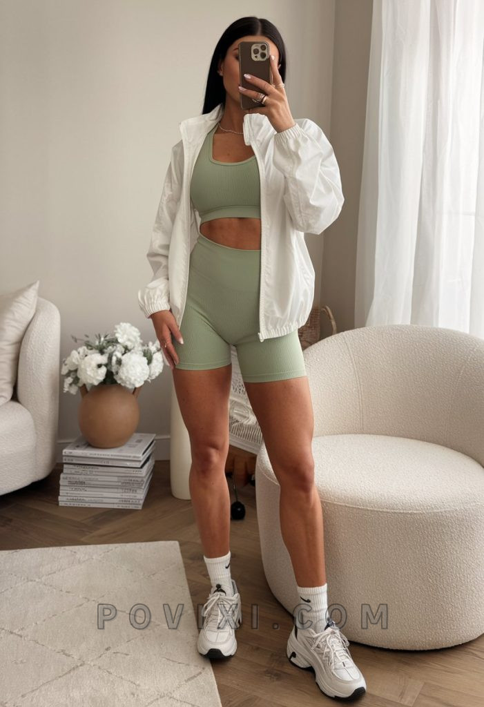For a more athletic vibe, this sage green biker short set, layered with a crisp white jacket, is ideal for school or casual errands. The fitted crop top and shorts bring an effortlessly put-together look, while the sneakers keep things practical. This outfit is a staple for spring and for summer. Pair with oversized sunglasses and a mini backpack for an effortless street-style look.