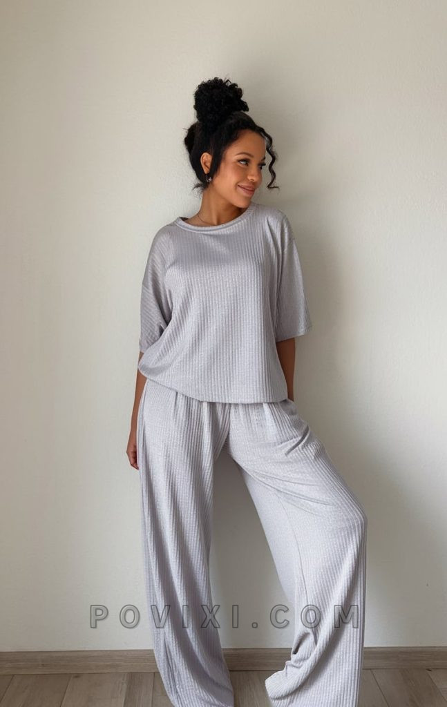 A wide-leg, ribbed loungewear set in a neutral tone is perfect for home and beyond. The oversized silhouette exudes relaxed sophistication, making it a great option for nights or cozy weekends. The soft, flowing fabric provides an elevated approach to loungewear, making it easy to transition from a lazy morning to a chic casual outing. Layer with an oversized coat and sneakers to transform it into an elegant airport outfit.
