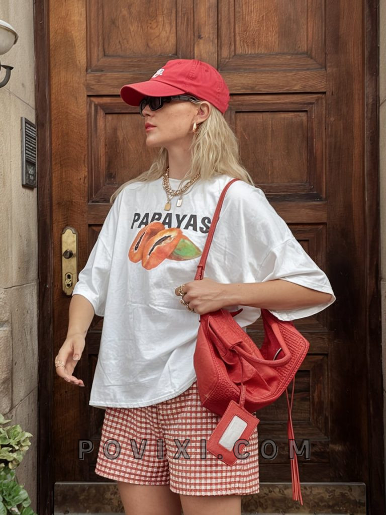 Street-style meets lazy day perfection in this oversized graphic tee and gingham shorts combination. The red baseball cap and matching bag create an effortlessly cool baddie aesthetic, making this outfit a standout choice for summer casual. This look embraces the relaxed, effortless energy of 2025, perfect for a casual day out. Opt for chunky sneakers or platform sandals to add height and balance the oversized look.
