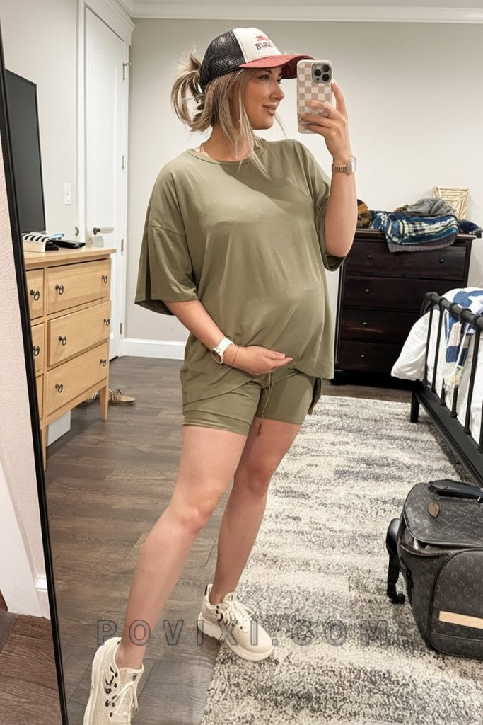 A two-piece lounge set is the ultimate casual comfy choice for expecting moms. This oversized T-shirt and casual shorts set in olive green is breathable and perfect for hot days. The loose fit allows for extra comfort, making it ideal for lounging at home, running errands, or even a photoshoot where you want a relaxed vibe. Paired with chunky sneakers, this look is both practical and trendy. Complete the ensemble with a cap for extra sun protection and a crossbody bag to keep things hands-free and effortless. This is an outfit that blends comfort and style seamlessly.