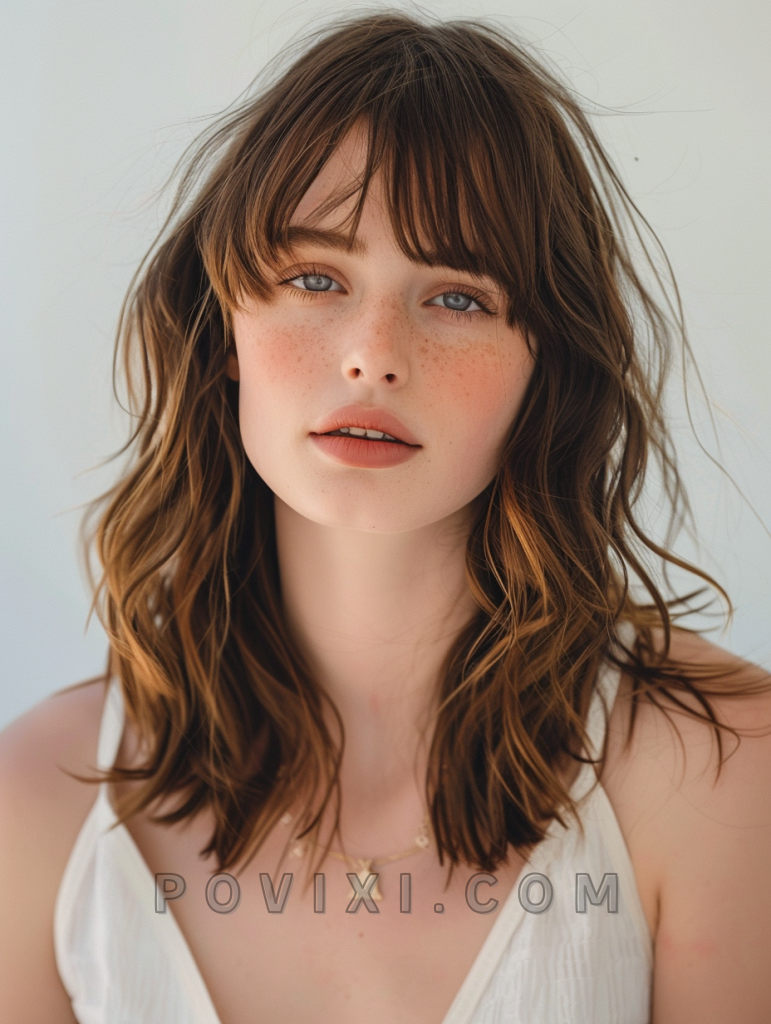 Adding bangs to a shoulder-length cut creates a playful yet sophisticated look, ideal for medium round faces. This hairstyle is great for casual events or professional environments, offering a fresh and youthful vibe.