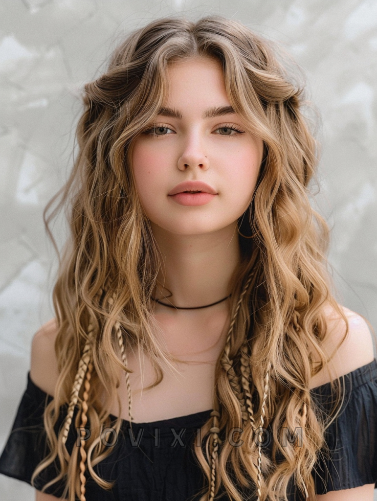 Integrate a touch of bohemian flair into your wavy hair with small, intermittent braids throughout a long layered hairstyle. This look not only adds a whimsical charm but also helps manage waves in a stylish way. It’s perfect for outdoor events or casual days where you want a bit of controlled creativity in your look.