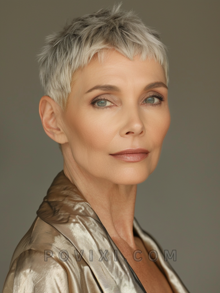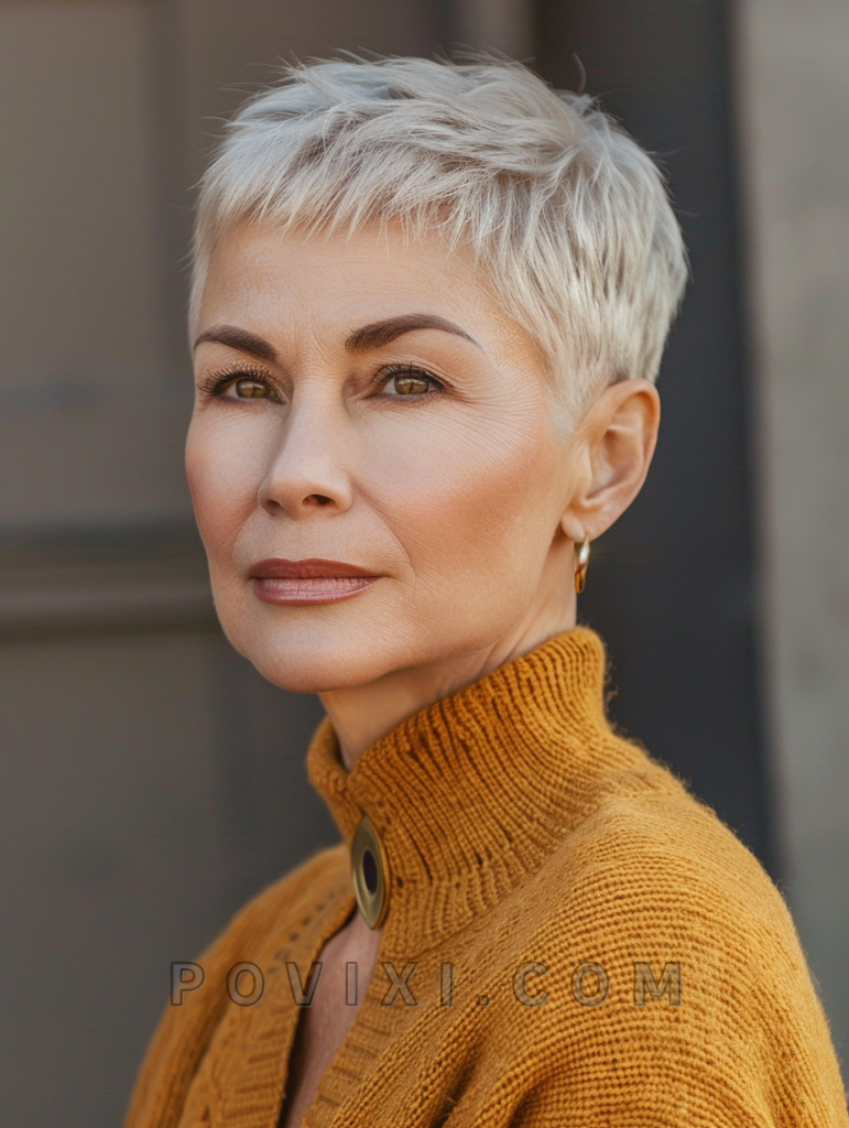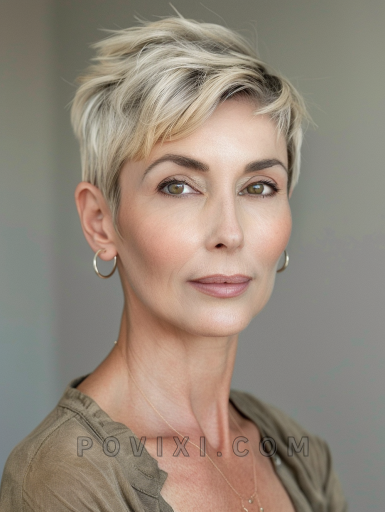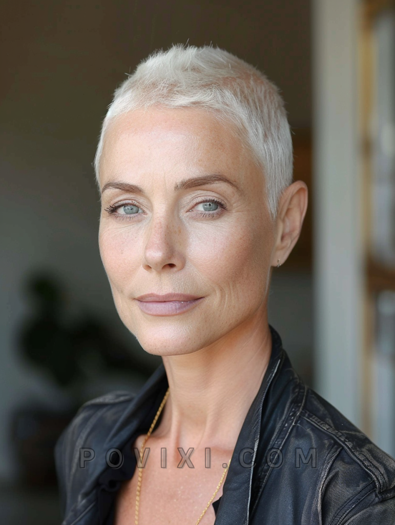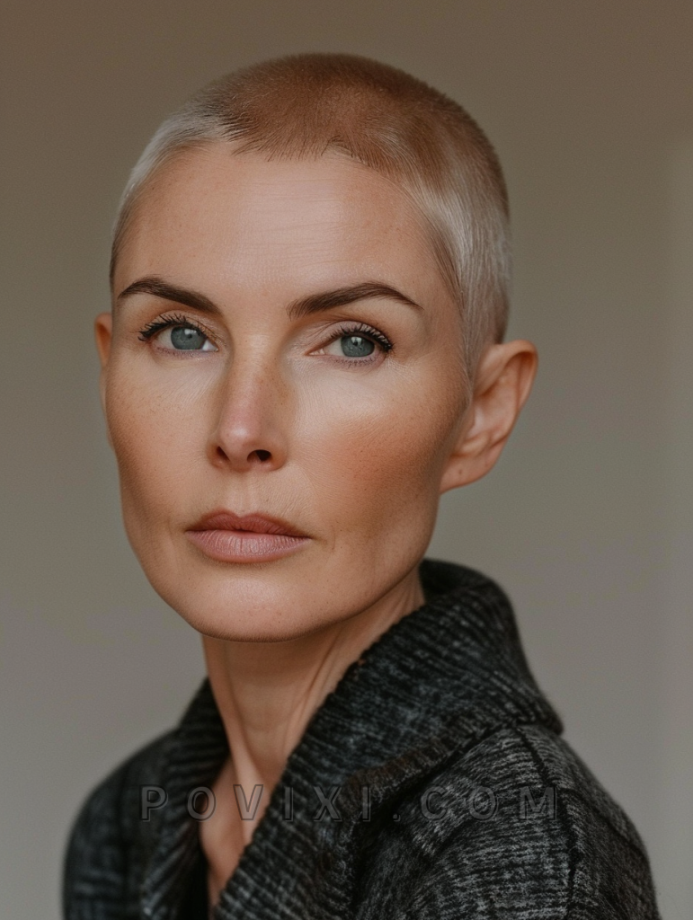 The buzz cut is a bold, low-maintenance option for women over 40 who want to make a statement with minimal effort. This style suits all face shapes and is especially powerful for highlighting strong facial features.