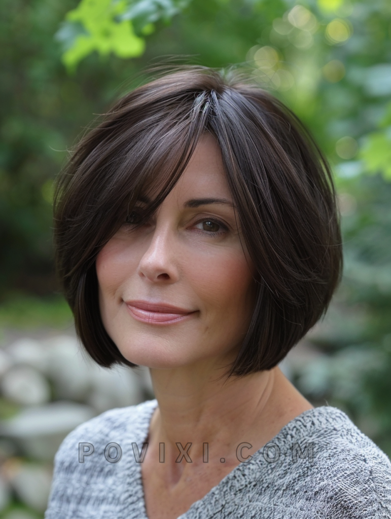 Revamp the classic bob with a side-swept bang that adds an element of mystery and style. Ideal for women with fine hair, this hairstyle provides volume and movement. It suits various face shapes, especially round faces, and is ideal for a professional environment or a social gathering.