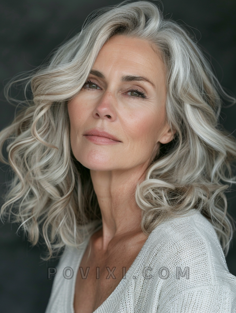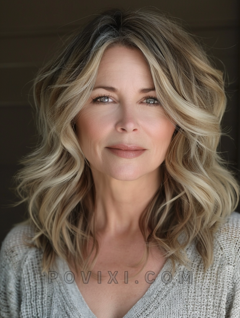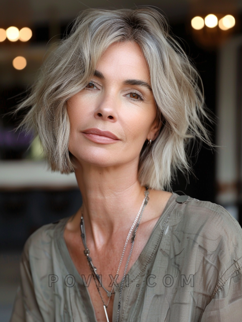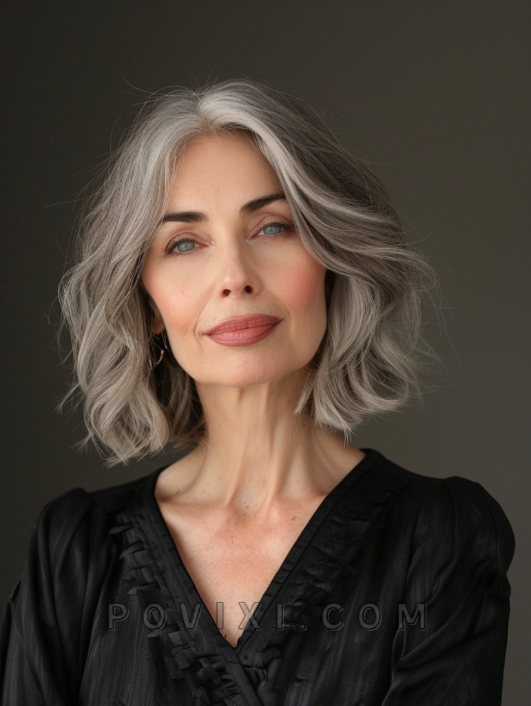 The wavy lob (long bob) with bangs adds a playful yet elegant element to the traditional bob. It’s perfect for women over 40 with round faces or those looking to add a youthful touch to their appearance.