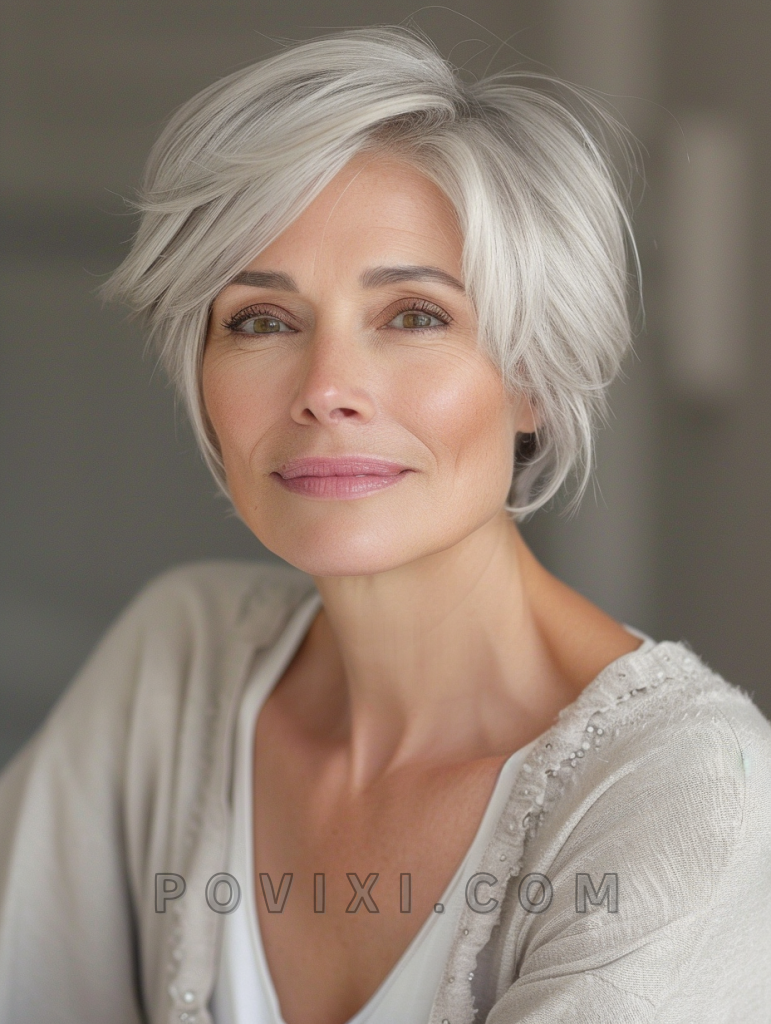 Embrace the elegance of gray hair with a side-parted silver fox style. This chic, short haircut is all about celebrating natural hair color with a sophisticated cut. It suits all face shapes and exudes confidence and grace.