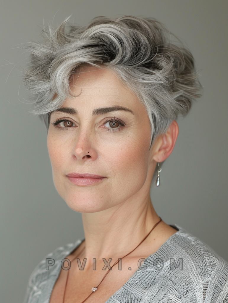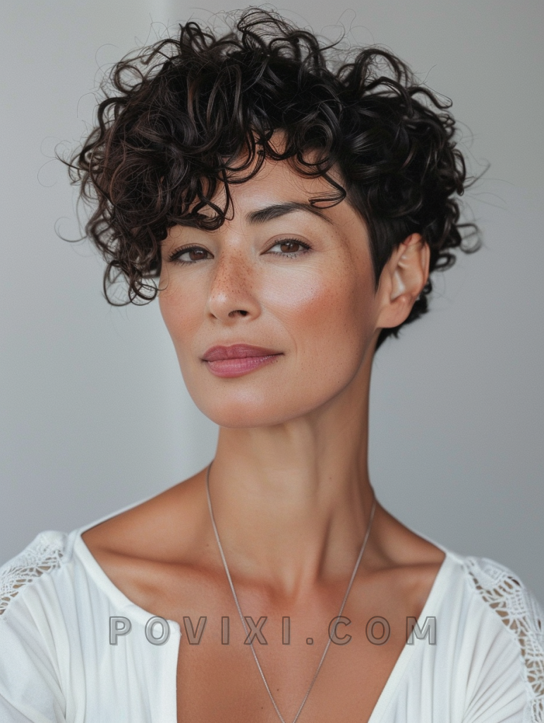 The curly pixie is an excellent choice for women with fine hair looking for a playful yet manageable hairstyle. This cut is particularly flattering for women over 40 with round faces, as it enhances the hair’s natural texture while offering a refreshing look.