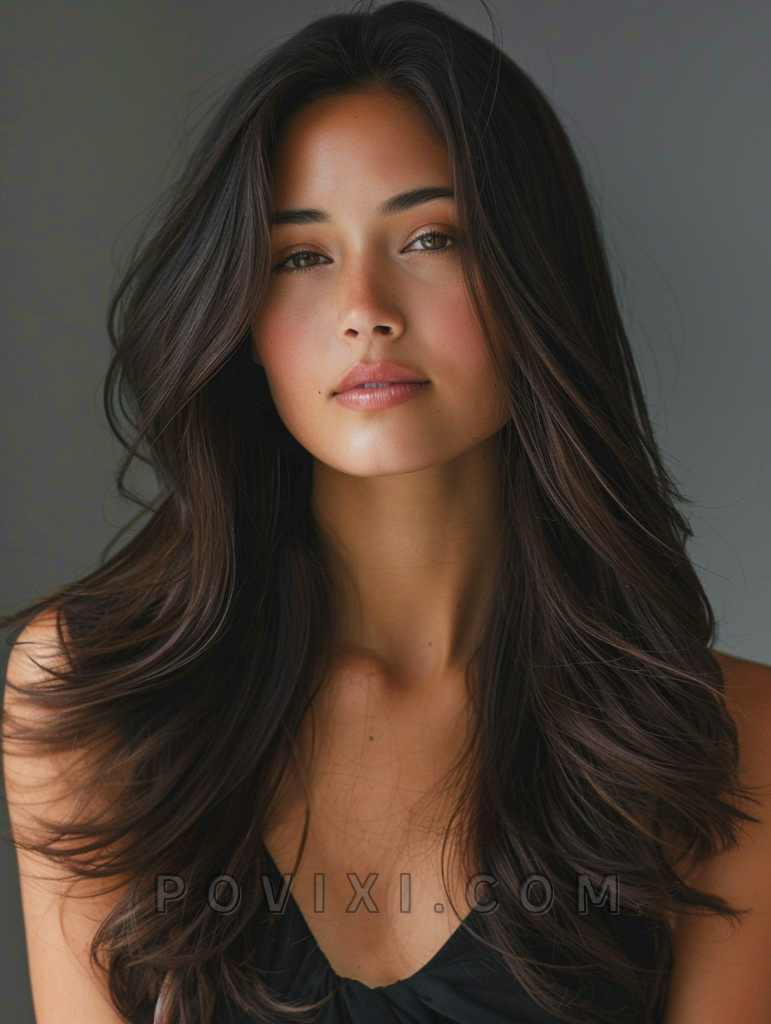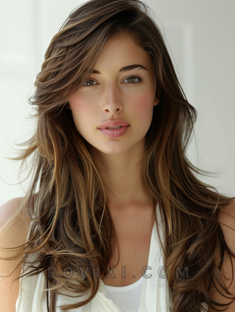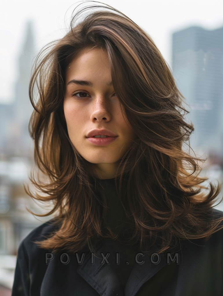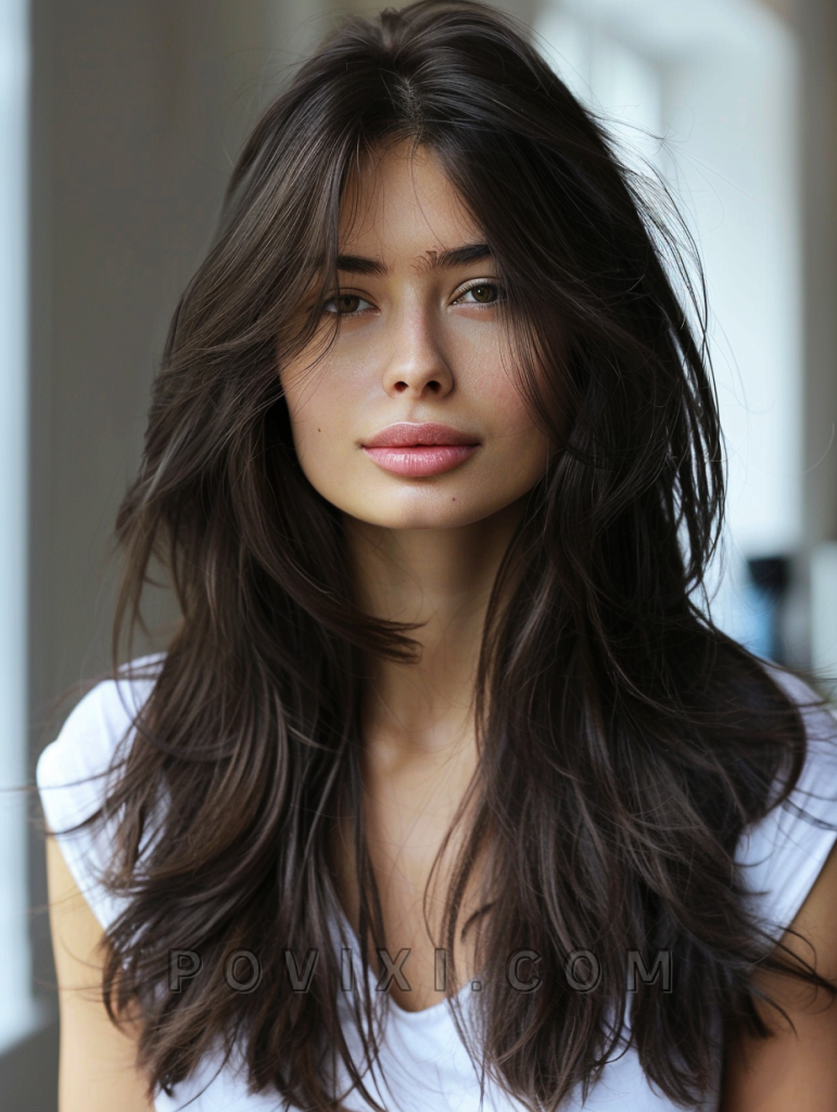 An edgy yet elegant take on the classic long layers is incorporating a deep side part. This look shifts the volume from center to side, creating a dramatic, asymmetrical effect that’s both modern and sophisticated.