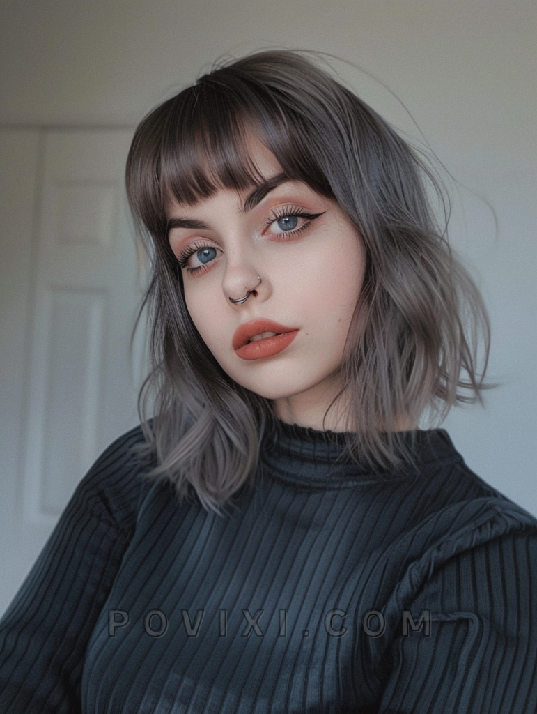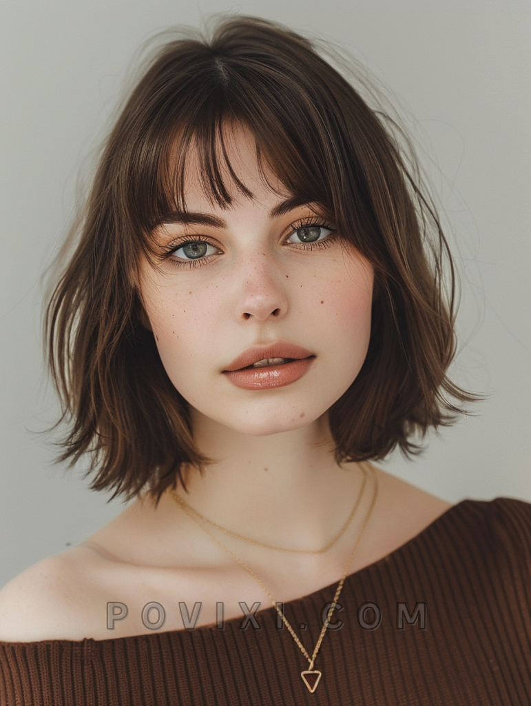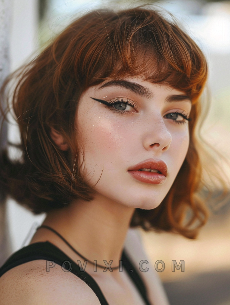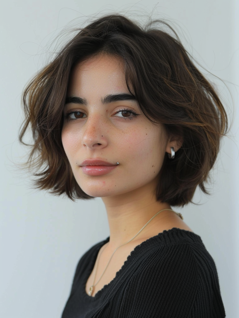 This short wolf cut with bangs is tailored for those with a round face, known as Corto con Flequillo Cara Redonda. The bangs add a youthful touch and draw attention to the eyes, making it an excellent choice for creative job interviews or casual coffee dates.