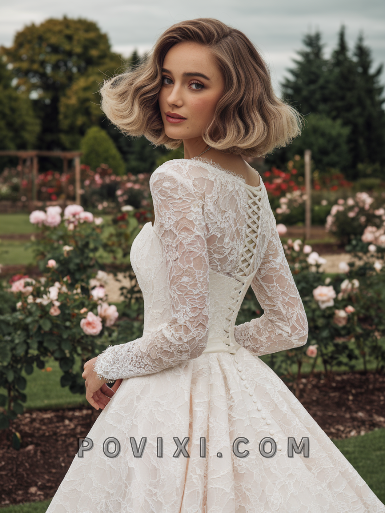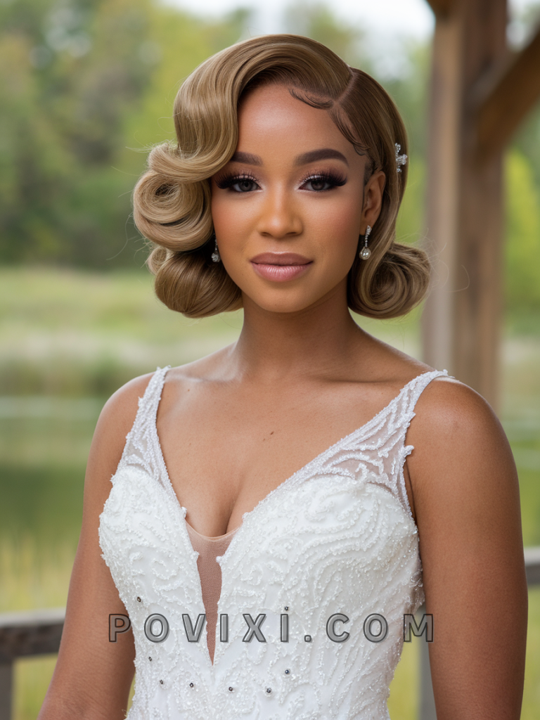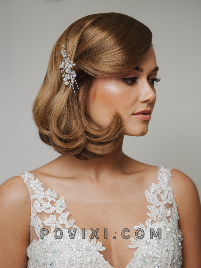 Short-haired beauties can shine with a bob styled into soft waves. This trendy option is ideal for short hair and works for both casual and formal weddings. It’s particularly flattering for heart-shaped faces and pairs well with bold makeup and simple accessories.
