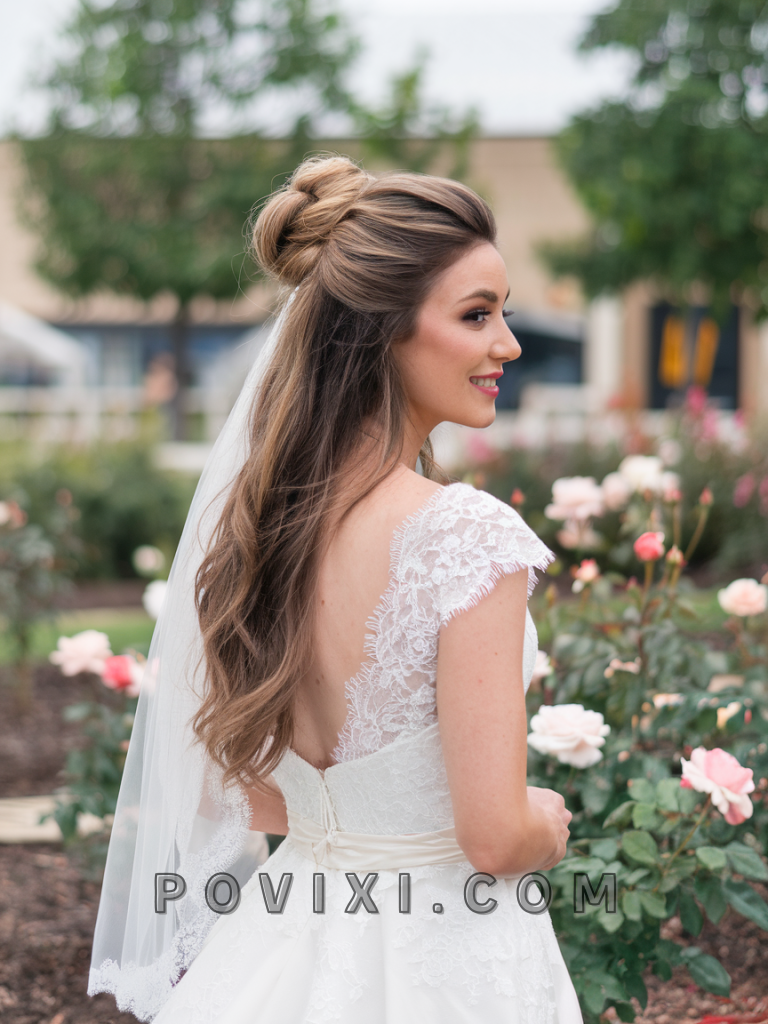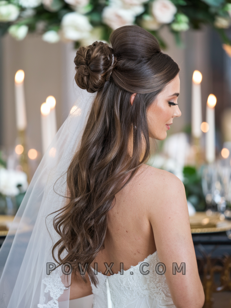 For a casual yet polished option, the half-up bun is a simple and easy style that works for long hair or medium-length locks. This style suits oval and round faces and is ideal for daytime or destination weddings.