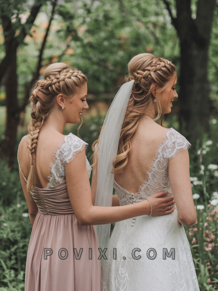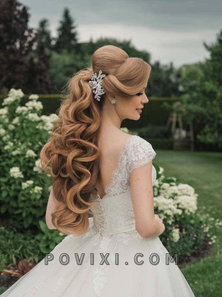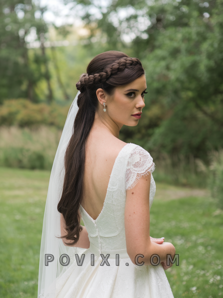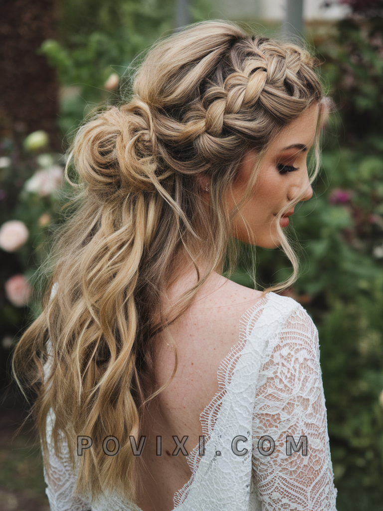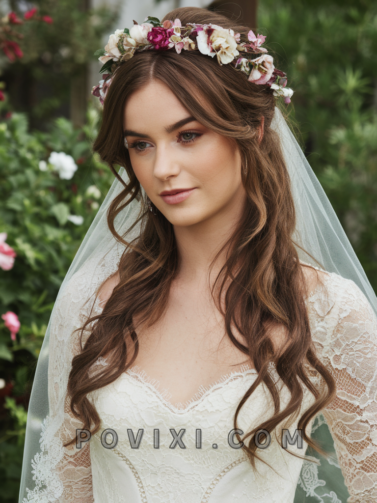For those who adore the boho aesthetic, the half-up twisted crown is a dream come true. This style combines loose waves with twisted sections of hair pinned into a crown-like shape, making it perfect for long hair or medium-length locks. Its versatility allows it to shine at outdoor weddings, particularly rustic or garden-themed events. The soft twists suit round and oval faces and complement light-colored dresses beautifully.