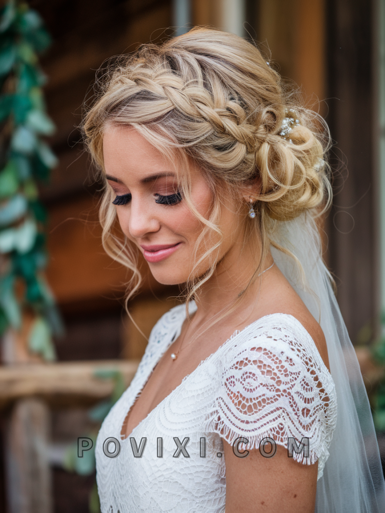 This boho braided updo combines intricate braids with a relaxed, messy finish, making it perfect for bridesmaids or brides seeking a romantic, carefree look. It’s ideal for medium hair or long hair and suits heart and oval face shapes. This style is a go-to for rustic, beach, or garden weddings.