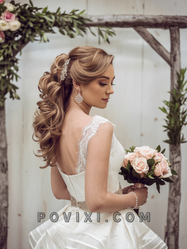 Side-swept curls are a glamorous yet simple hairstyle that works for medium-length to long hair. This style involves cascading curls swept to one side, creating a dramatic and romantic silhouette. It’s a popular choice for brides and pairs beautifully with veils or bold earrings.