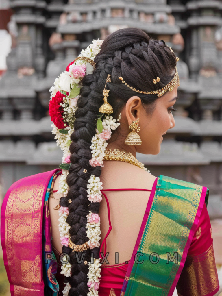 Drawing inspiration from traditional South Indian styles, this intricate braid is adorned with flowers, jewels, or gold accessories. Perfect for bride or bridesmaids, it’s a showstopper for cultural ceremonies. This style works best with long hair or extensions and suits oval or diamond face shapes.