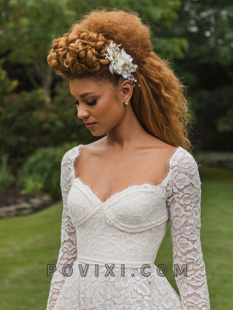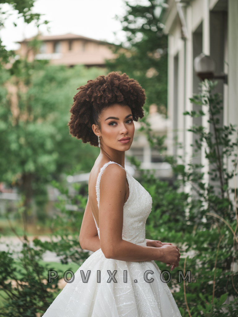 For brides and bridesmaids with curly hair, an Afro goddess updo is a regal and standout option. This style celebrates natural textures by shaping curls into a voluminous bun or series of twists at the crown. It’s ideal for medium hair or short hair and works beautifully with off-shoulder dresses. This hairstyle is a stunning choice for black brides and adds a touch of cultural elegance to any ceremony.