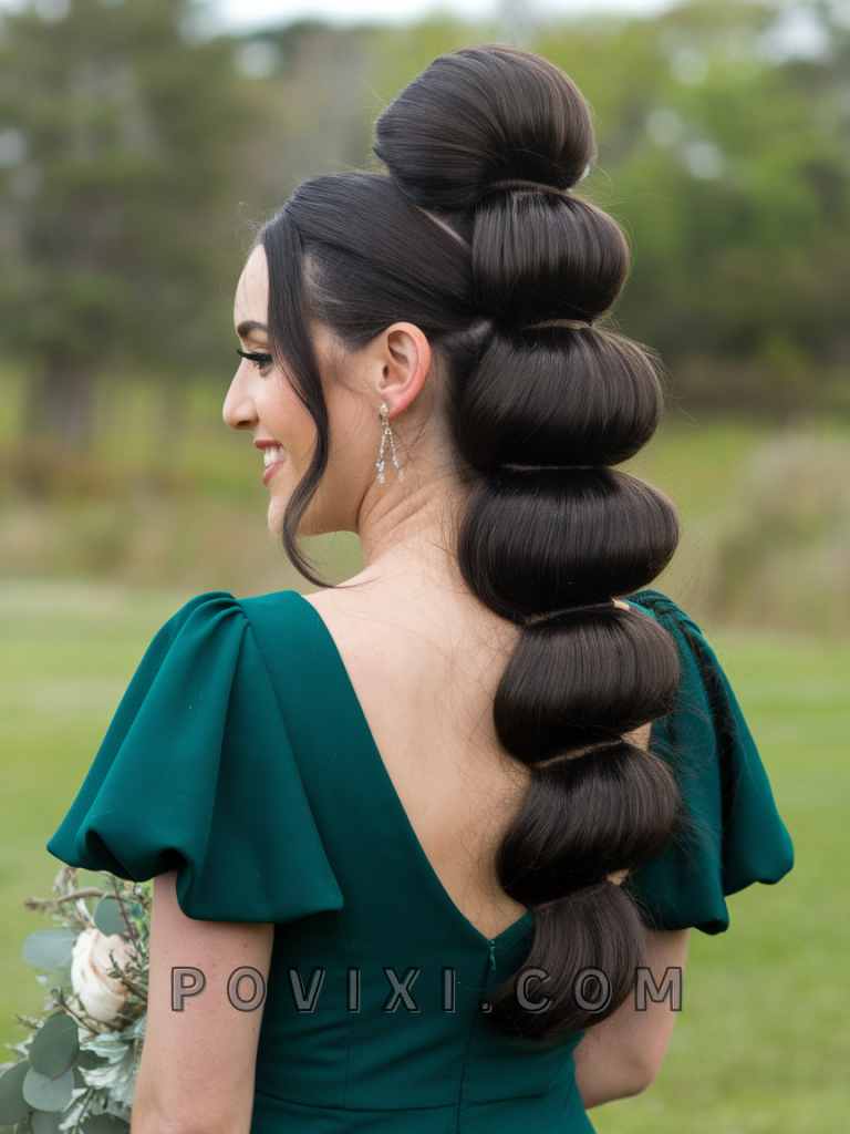 The bubble ponytail is a modern and playful twist on the classic ponytail. This style works beautifully for long hair and is especially flattering for oval and square face shapes. It’s a fantastic option for bridesmaids or even a bride looking for a trendy yet easy-to-manage style. This voluminous and textured ponytail is perfect for outdoor weddings or receptions with a fun, laid-back vibe.