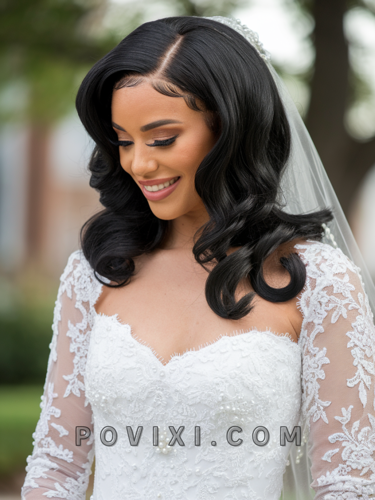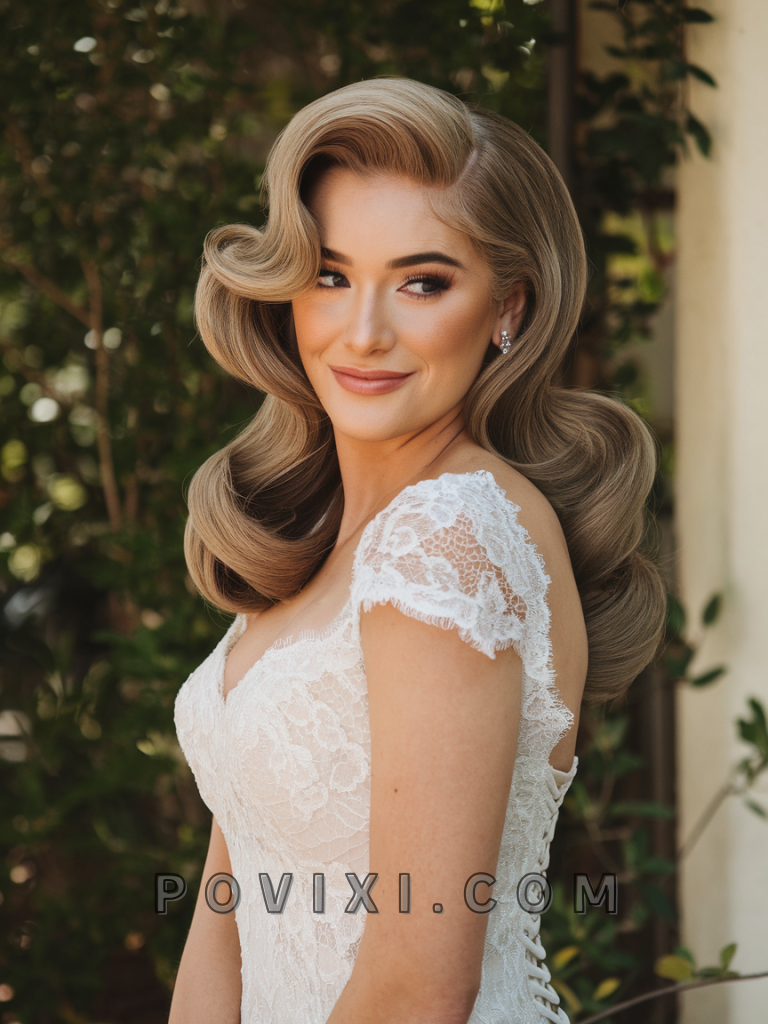 Hollywood glam waves are a timeless and elegant choice for brides who love vintage aesthetics. This style, with its structured S-shaped waves, is perfect for formal evening weddings and looks incredible for brunettes, blondes, and even black hair. It works best for medium-length to long hair and pairs beautifully with classic red lipstick and dramatic earrings.