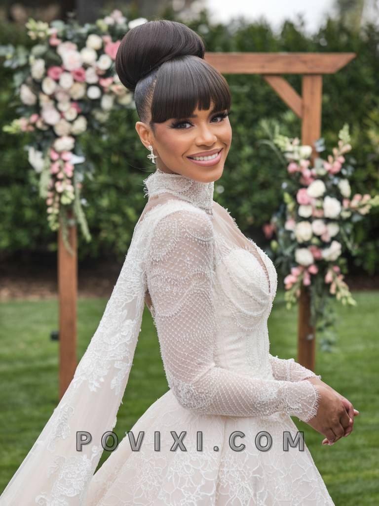 The sleek high bun with bangs is a timeless updo that radiates sophistication. This style is perfect for bride or bridesmaids, particularly for formal or evening weddings. It works best for medium-length to long hair and complements oval and heart-shaped faces.