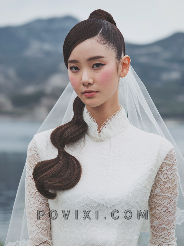 Channel your inner minimalist with a Korean-inspired sleek ponytail. This style is trendy yet timeless, offering a clean, polished look for medium hair, long hair, or thin hair. With hair slicked back into a mid-height ponytail, it exudes elegance and simplicity, making it perfect for modern weddings. This style complements square or oval faces and looks particularly striking on brunettes.