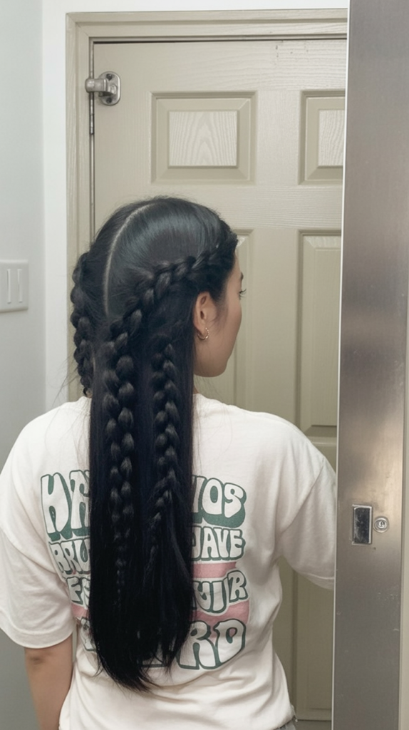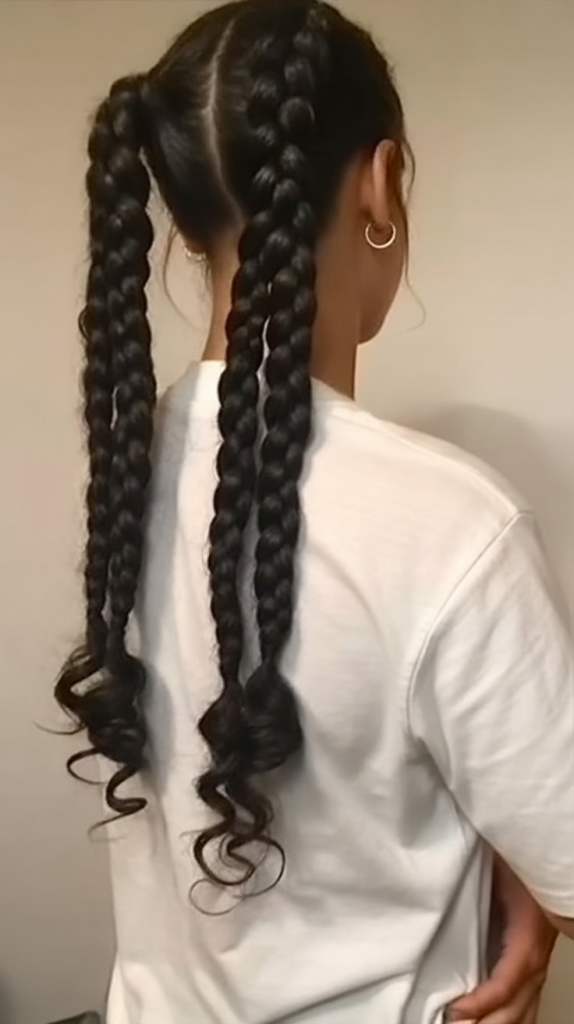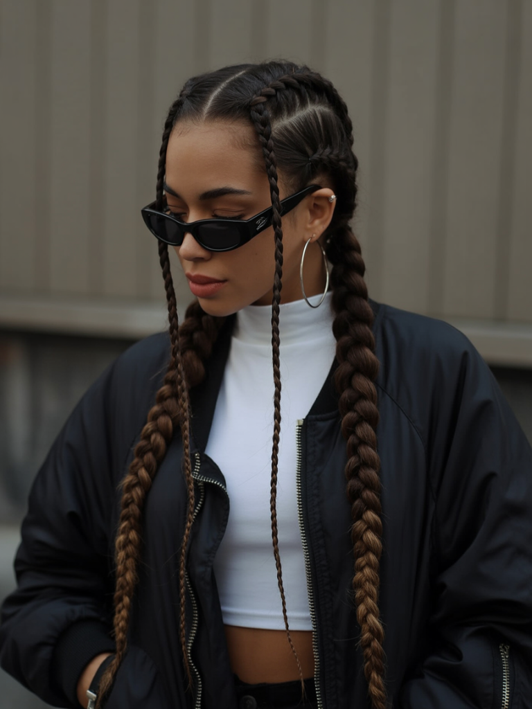 Smooth-finished twin braids have an edgy and urban vibe that complements street style fashion perfectly. The long, straight lines of the braids provide structure, while free strands in the front provide softness and balance. This is a type of braid that will make you feel chic and cool at the same time.