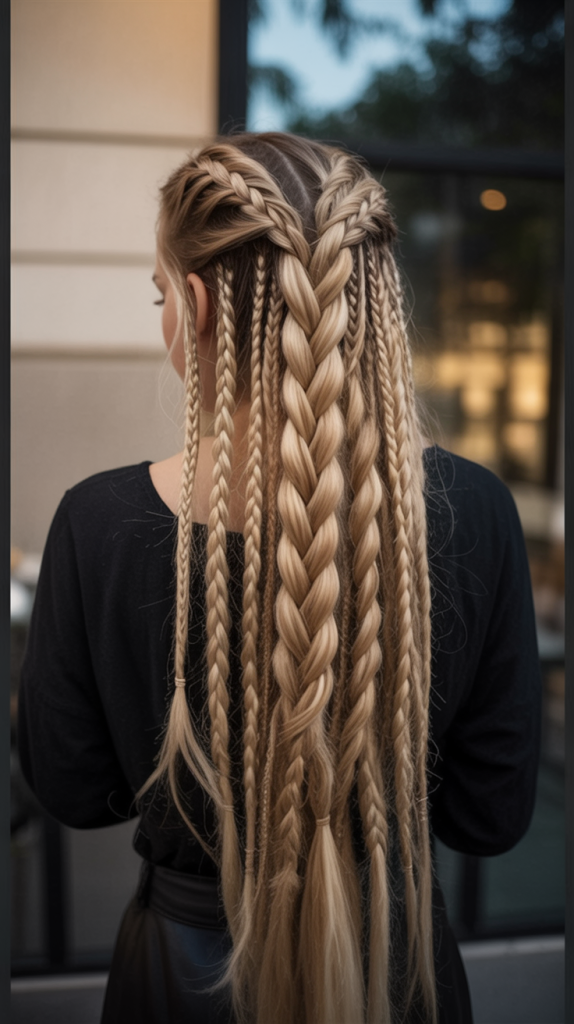 This is a layered and creative braid idea. With its multiple braids of varying sizes cascading down, it transforms into a masterpiece of texture, exuding boldness and artistry. With a perfect blend of precision and movement, this hairstyle is ideal for women who enjoy making a statement with their style.