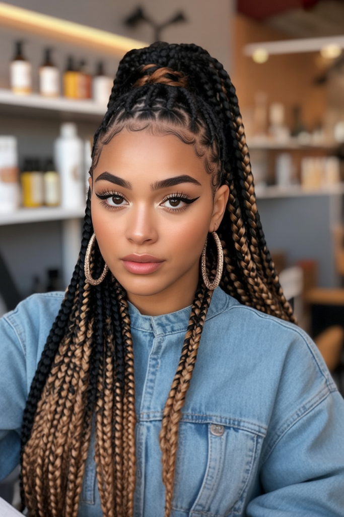 This style is perfect for women who love dramatic color contrasting and want their hair to feel fashion forward. The ombre effect gives it depth and a touch of on-trend for 2025 while the braids keep it protective and practical. It’s ideal for making an impact with earrings and bold makeup statements as well.