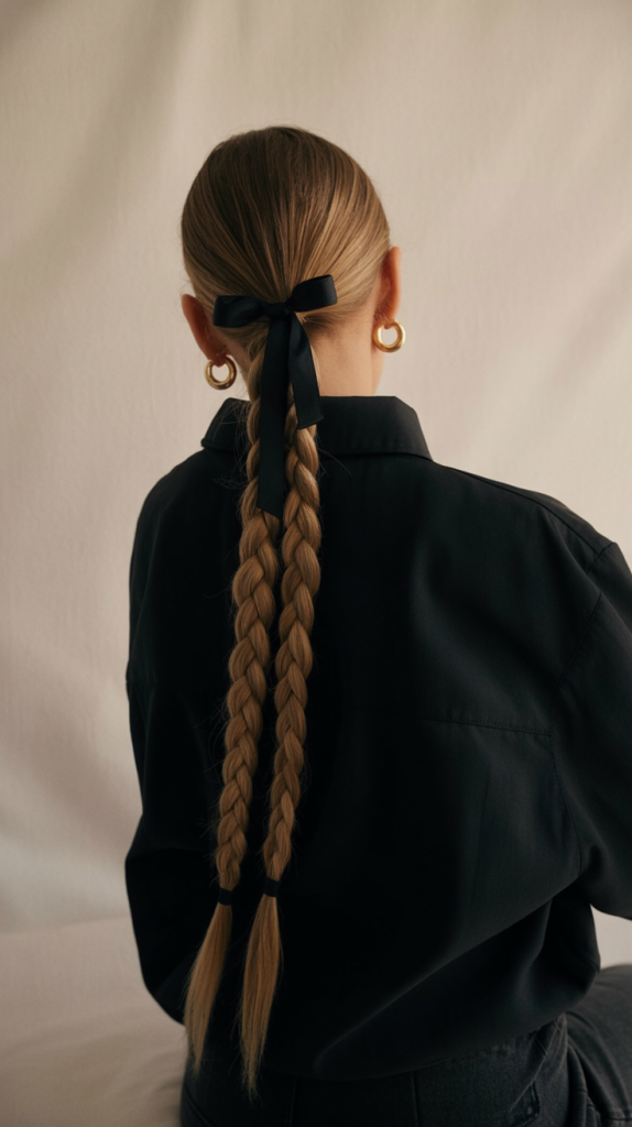 Adding a ribbon at the base of a braid turns it from ordinary to elegant. This stylish look is timeless and elegant with a touch of femininity. The ribbon detail adds a chic yet intentional aspect – ideal for winter dinner, work, and even festive occasions.