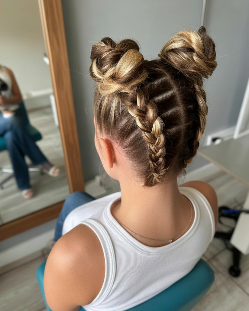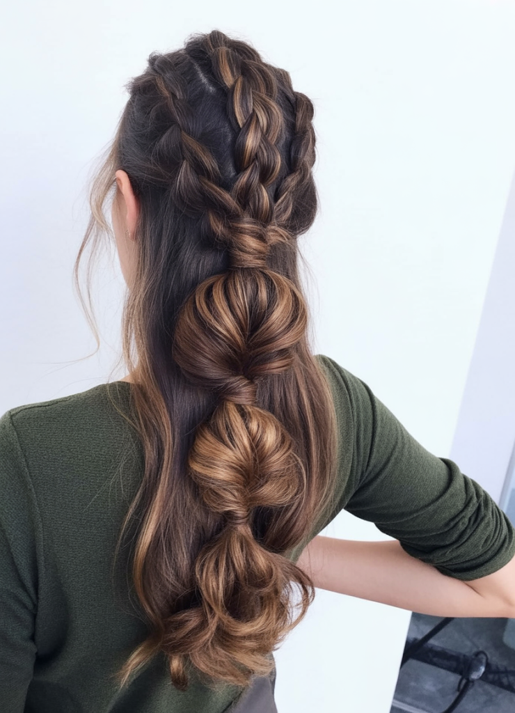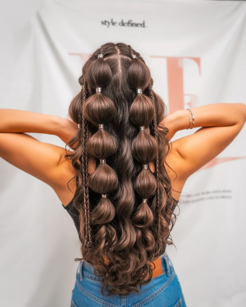 Women who like a bold look might like this one. The accessories make it extra fun and the bubbles make it playfully fun. It’s particularly perfect for long and thick hair as it emphasizes volume while providing a fashionable twist for 2025.