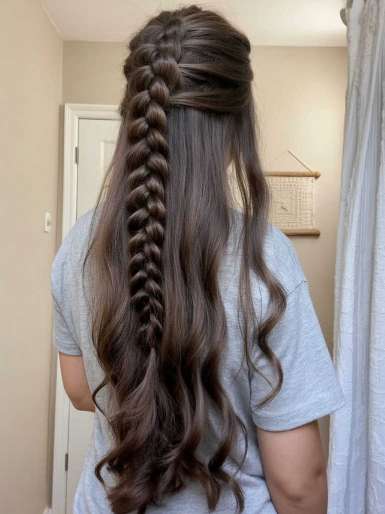 A half-up braid with teased volume is soft, romantic, and very dreamy and elegant. The deep plait down the centre adds form, while the loose waves flowing underneath add movement and femininity. It’s the kind of braid you feel beautiful in without being showy, ideal for cold winter days.